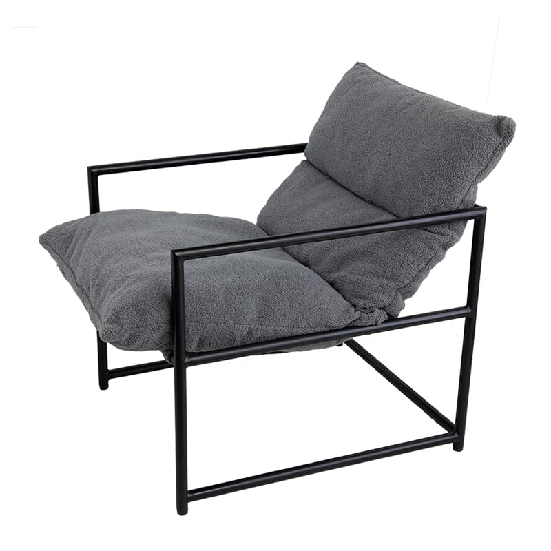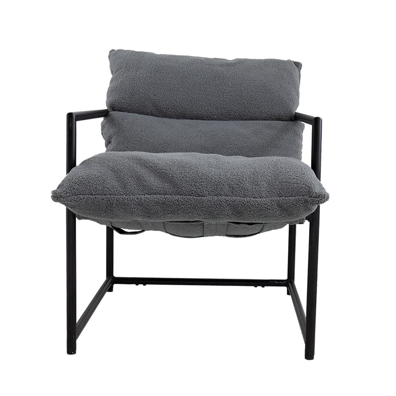 The Fondan armchair features a modern industrial design with a minimalist, geometric metal frame in black. It includes a large, plush seat and back cushions in a soft, gray fabric, providing comfort and style. The frame is made from sleek black metal, which contrasts beautifully with the soft, textured upholstery. The cushion design is laid-back and relaxed, which adds a contemporary, comfortable look to any space. The low, wide seating is designed for lounging, and the back features multiple horizontal cushions, offering both visual interest and extra support.