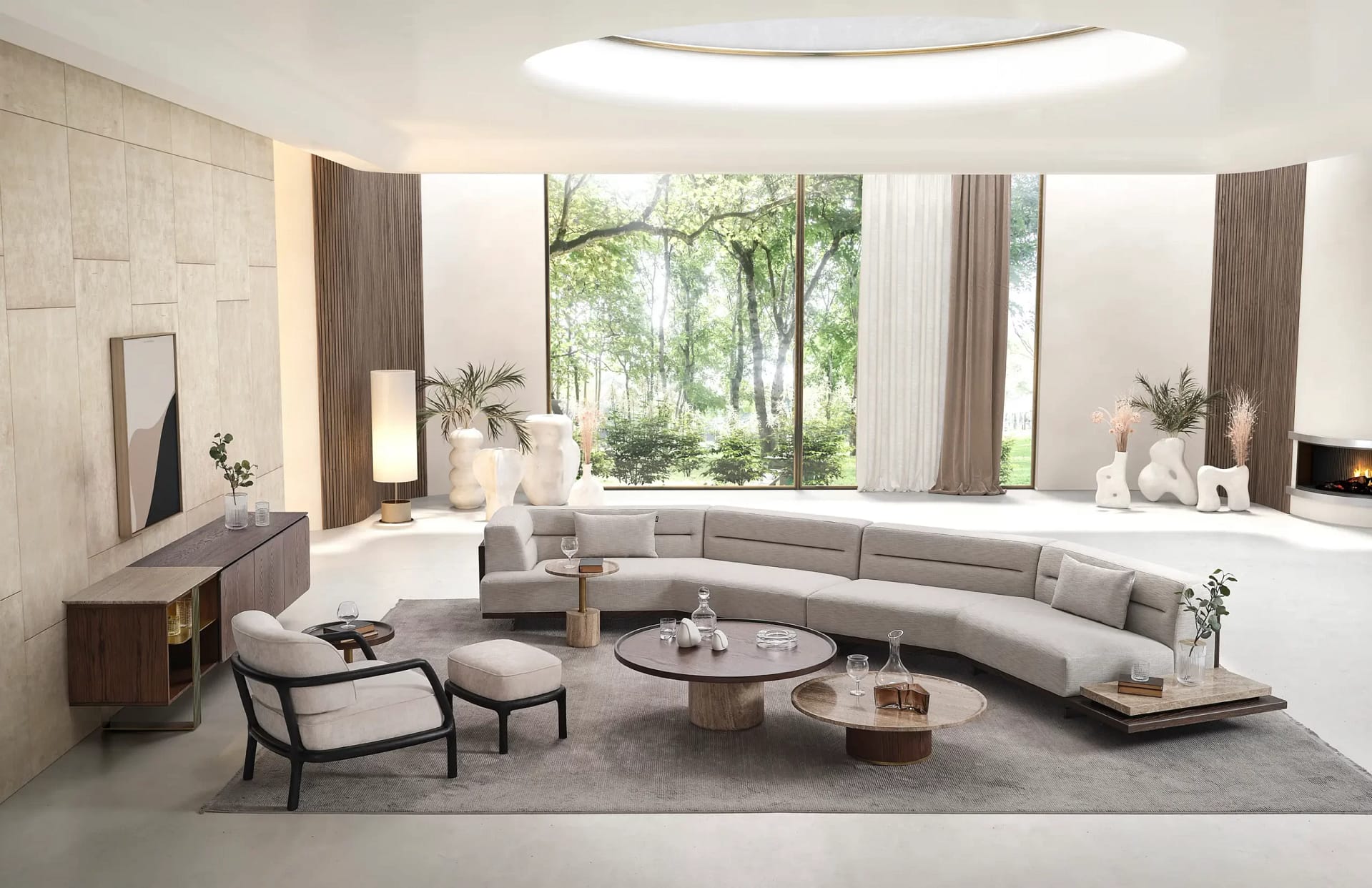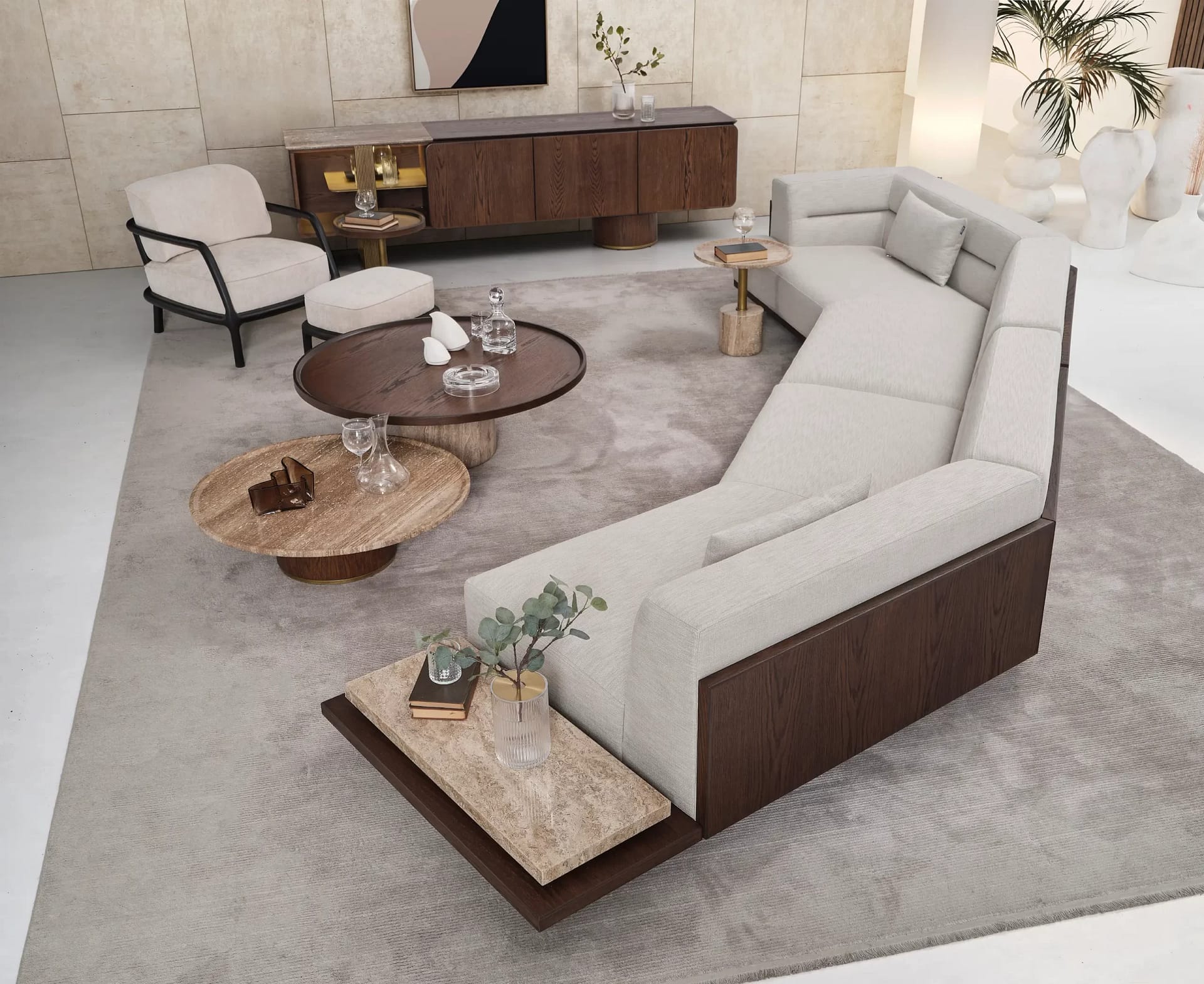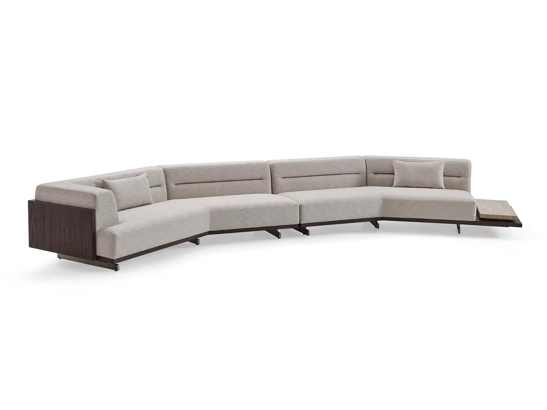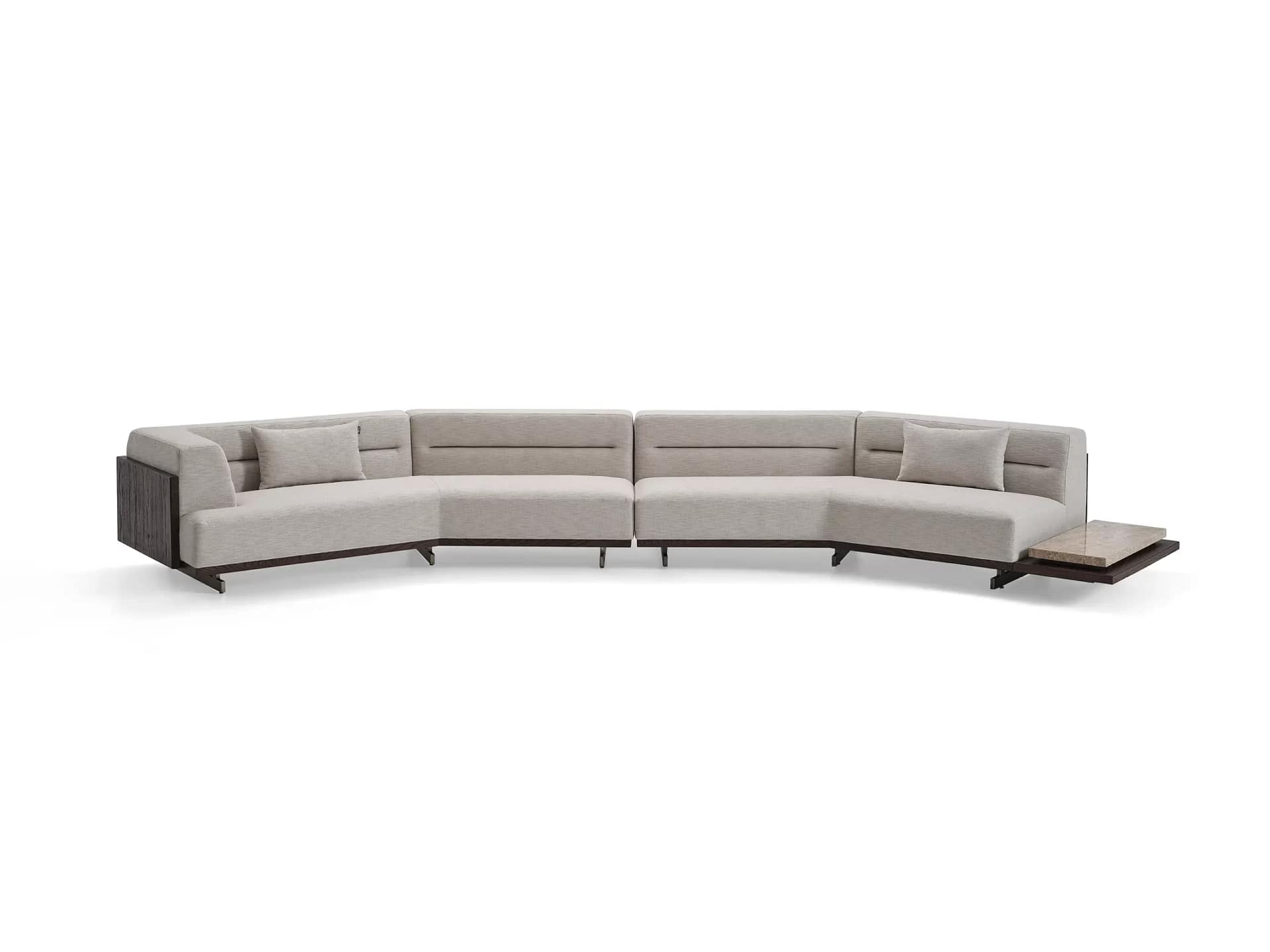 The Antik sectional sofa has a sophisticated and modular design that features clean lines and a neutral beige upholstery. It offers a built-in side table and a marble top table, which serve as side platforms for decor or practical use, thus blending functionality with a contemporary aesthetic. Its sectional configuration provides ample seating, and its geometric design allows for customization in layout, making the Antik sofa a versatile centerpiece for modern living rooms.