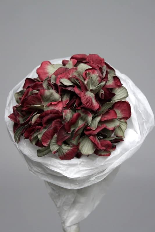This lush and full cluster of burgundy flowers, with bloom that boast of delicately rounded petals that transition from deep burgundy to subtle green undertones. The combination of rich hues and muted shades creates depth and visual interest. Wrapped in fine white paper, this arrangement is perfect for creating a statement of refined luxury.