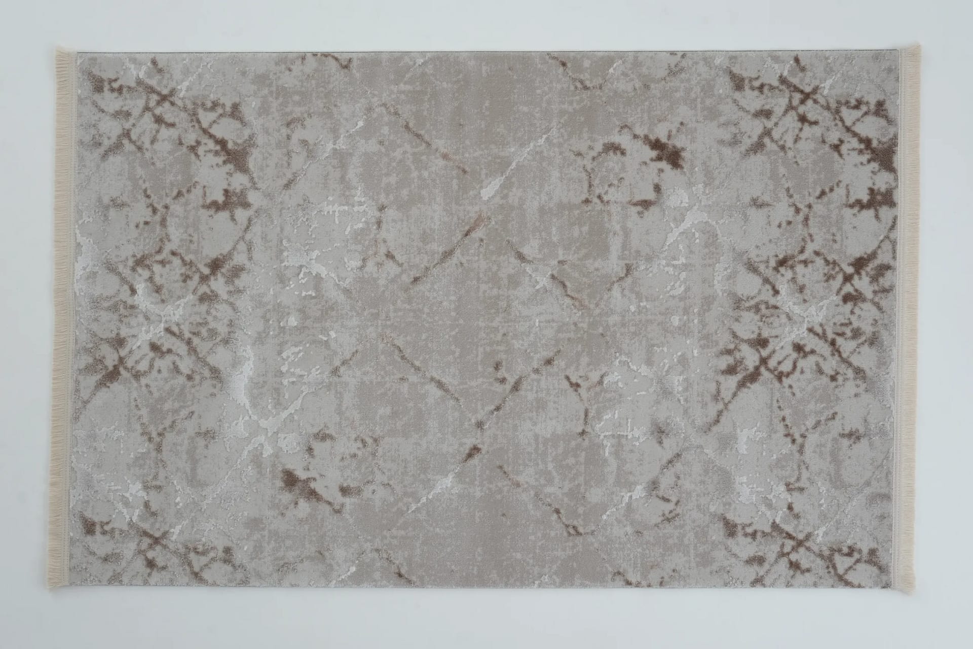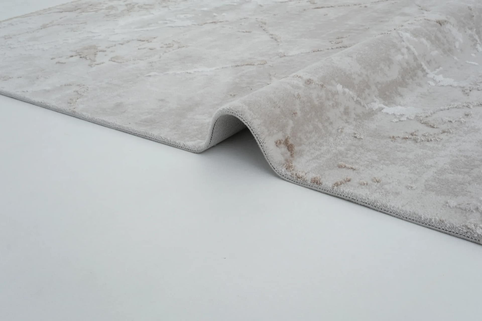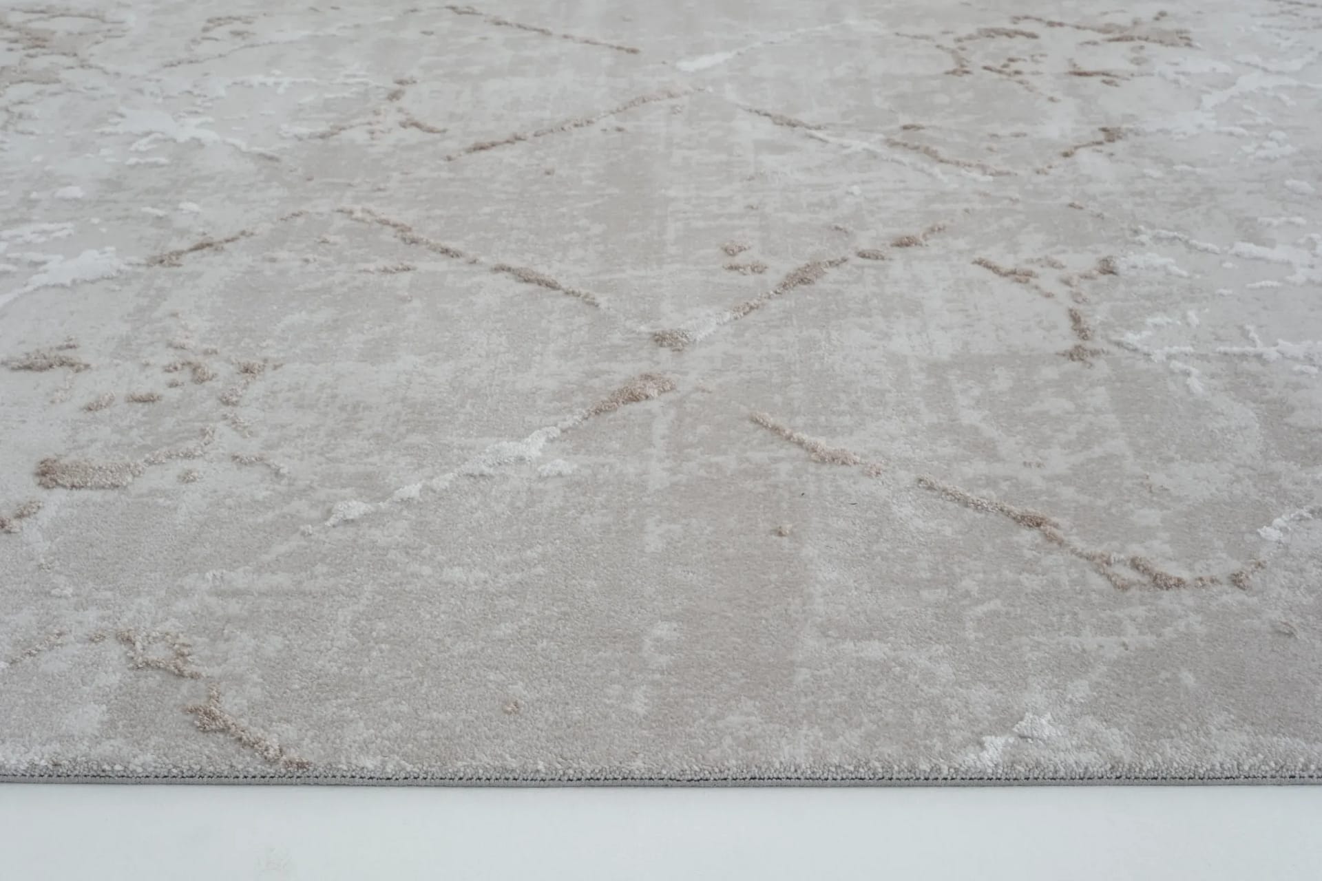 This contemporary rug presents a delicate interplay of textures and patterns, with a faint lattice-like design subtly woven into a distressed cream and gray background. The intricate details of marble veining and muted tones give it a serene, organic quality, reminiscent of aged stone or weathered textiles. Its subtle design allows it to seamlessly blend into various decors, while adding depth and texture to the room. It comes in different sizes.
