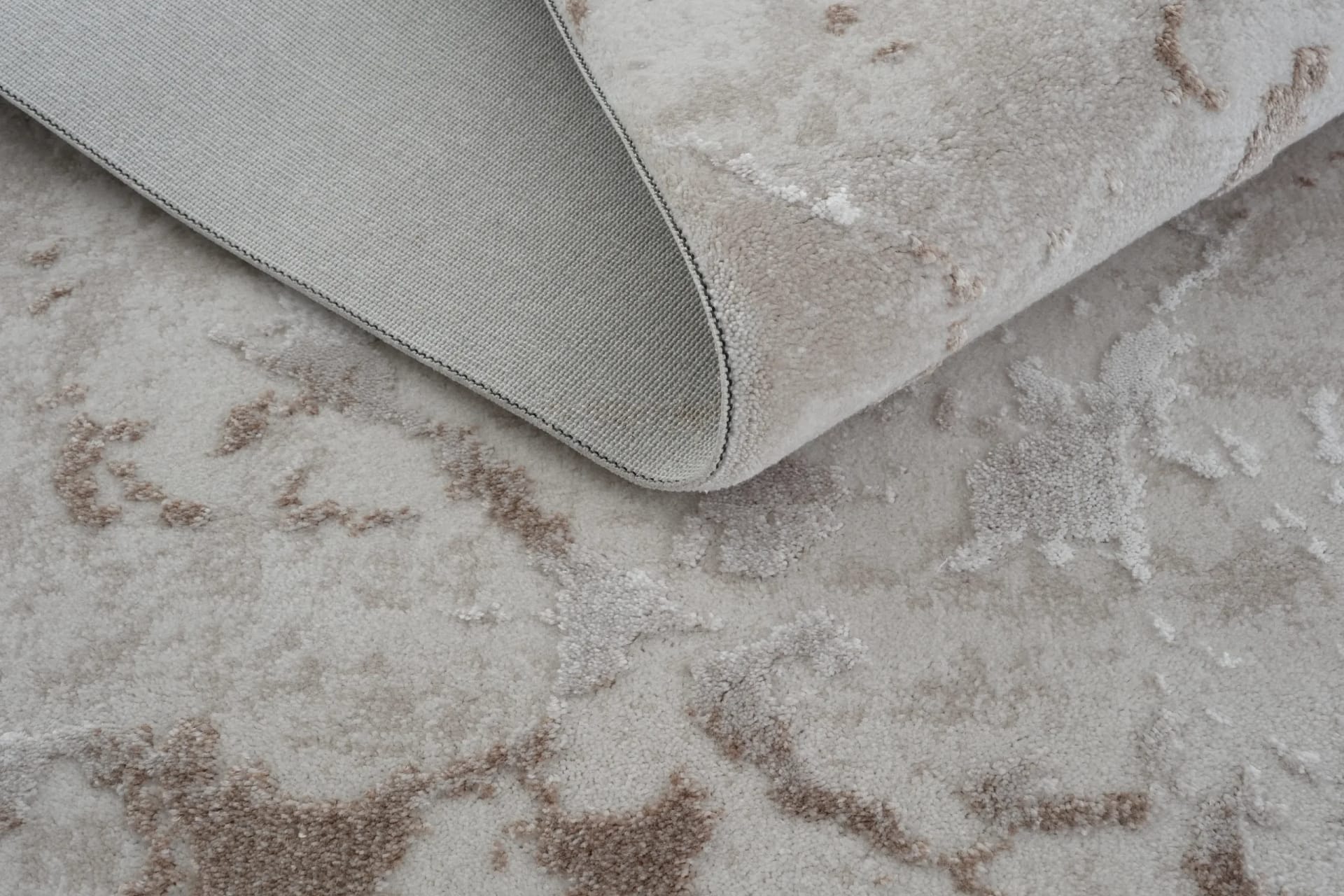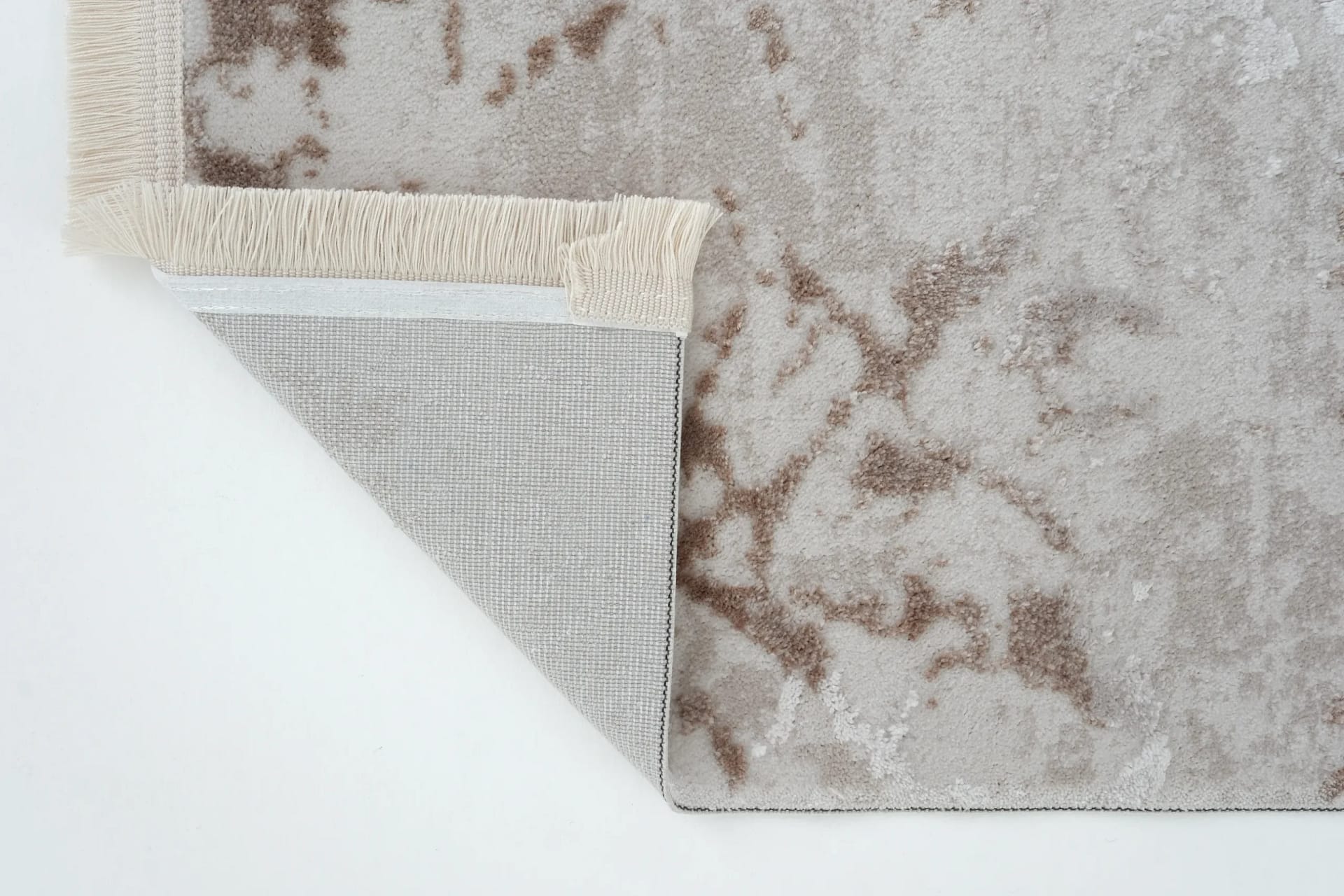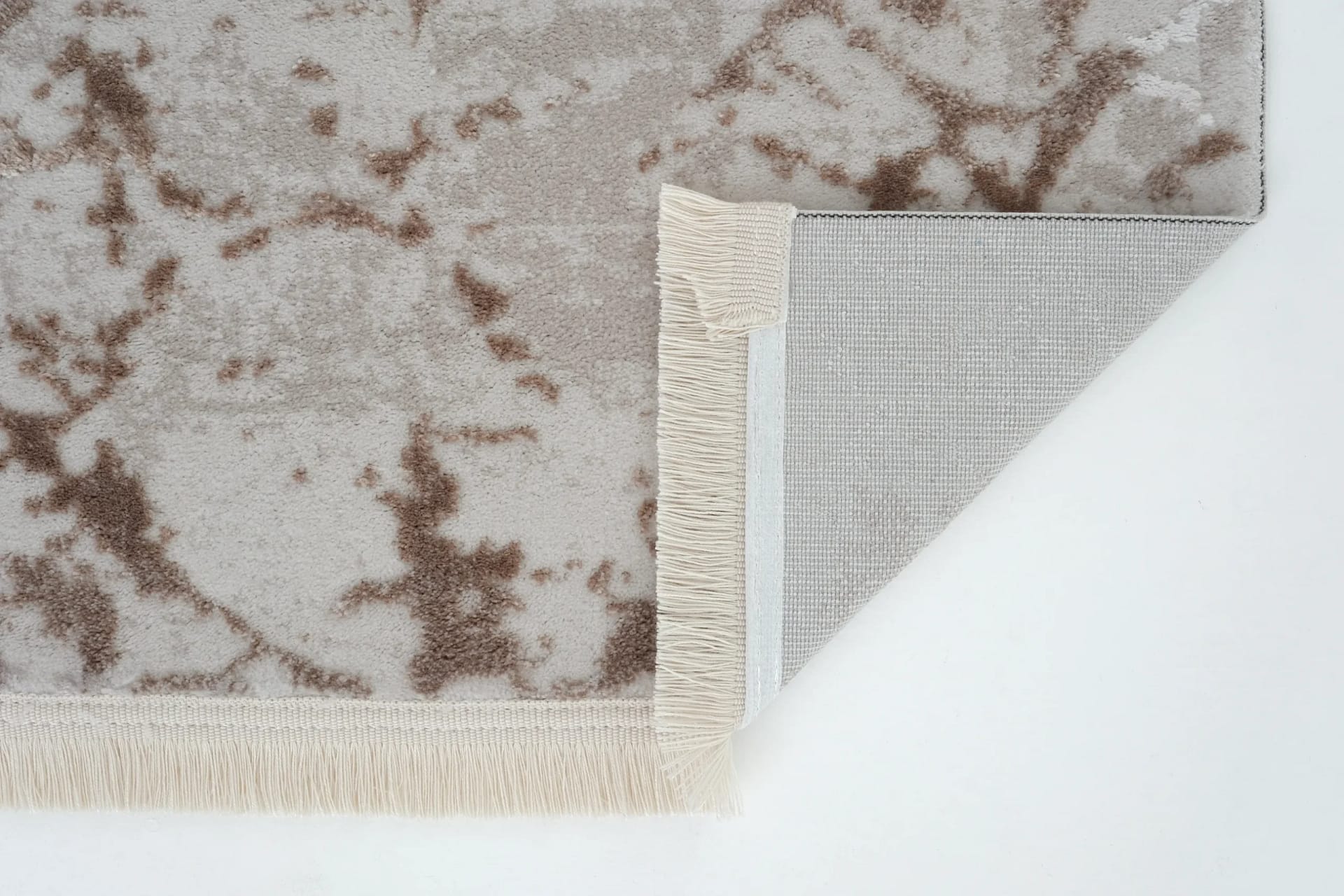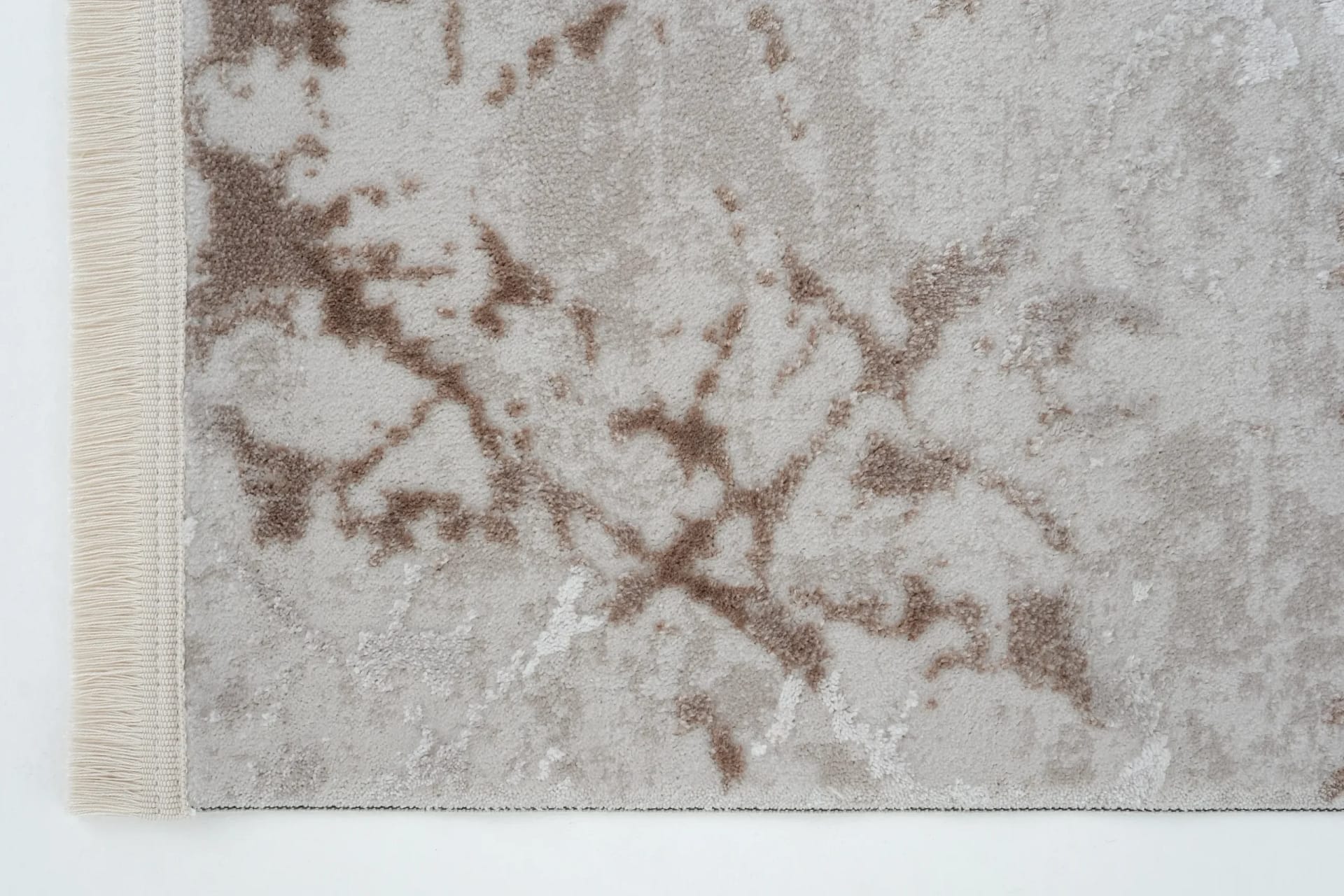 This contemporary rug presents a delicate interplay of textures and patterns, with a faint lattice-like design subtly woven into a distressed cream and gray background. The intricate details of marble veining and muted tones give it a serene, organic quality, reminiscent of aged stone or weathered textiles. Its subtle design allows it to seamlessly blend into various decors, while adding depth and texture to the room. It comes in different sizes.