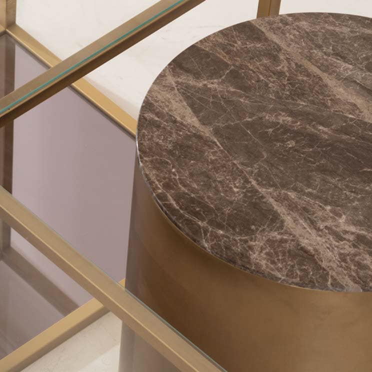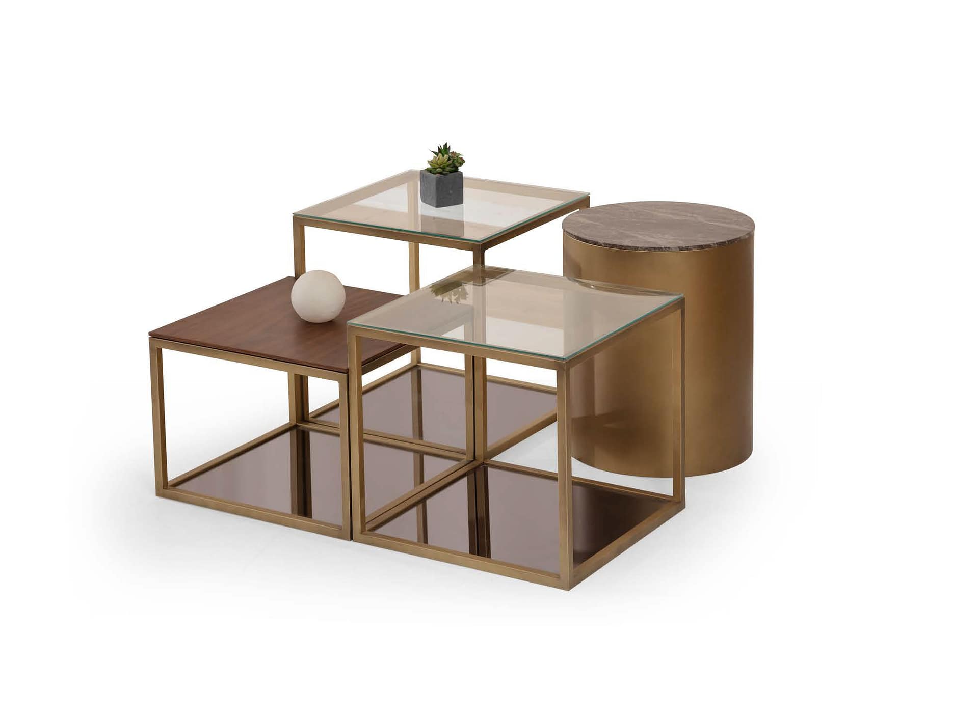 The Monte coffee table is a sophisticated fusion of mid-century charm and modern design. The square tabletop, crafted from rich, brown-toned wood, showcases its smooth, rounded edges, adding an element of softness to its angular form. It has a marble top section, which can serve as a coaster. It rests atop a bold, flared metal base with a brushed brass finish, creating a striking contrast. It is perfect for anchoring a living room setup, and its design strikes a balance between functionality and artistic appeal.