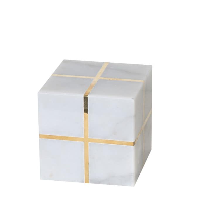 Featuring a cube shape, this black sculpture is made from marble and embedded with brass lines, creating a subtle yet intriguing design. The smooth surfaces and geometric form give it a contemporary feel, while the golden detailing adds a hint of luxury. This playful yet refined piece works well in modern living rooms, offices, or as a decorative accent on side tables. Its versatility and artistic design make it a chic addition to any space.