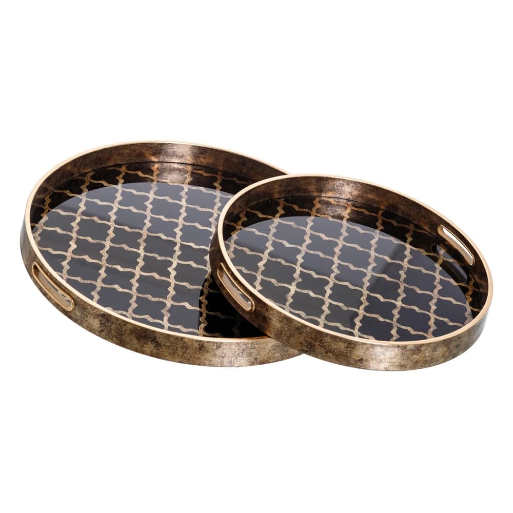 The Moroccan tray is a set of two round serving trays with an opulent vintage charm. They feature a stunning gold-toned nickel frame and intricate Moroccan-inspired geometric patterns on a glossy black base. Designed with functional cutout handles for ease of use, these trays are perfect for serving beverages or as elegant decorative pieces. Their versatile design makes them suitable for both modern and traditional interiors, as they add a touch of glamour to any setting.