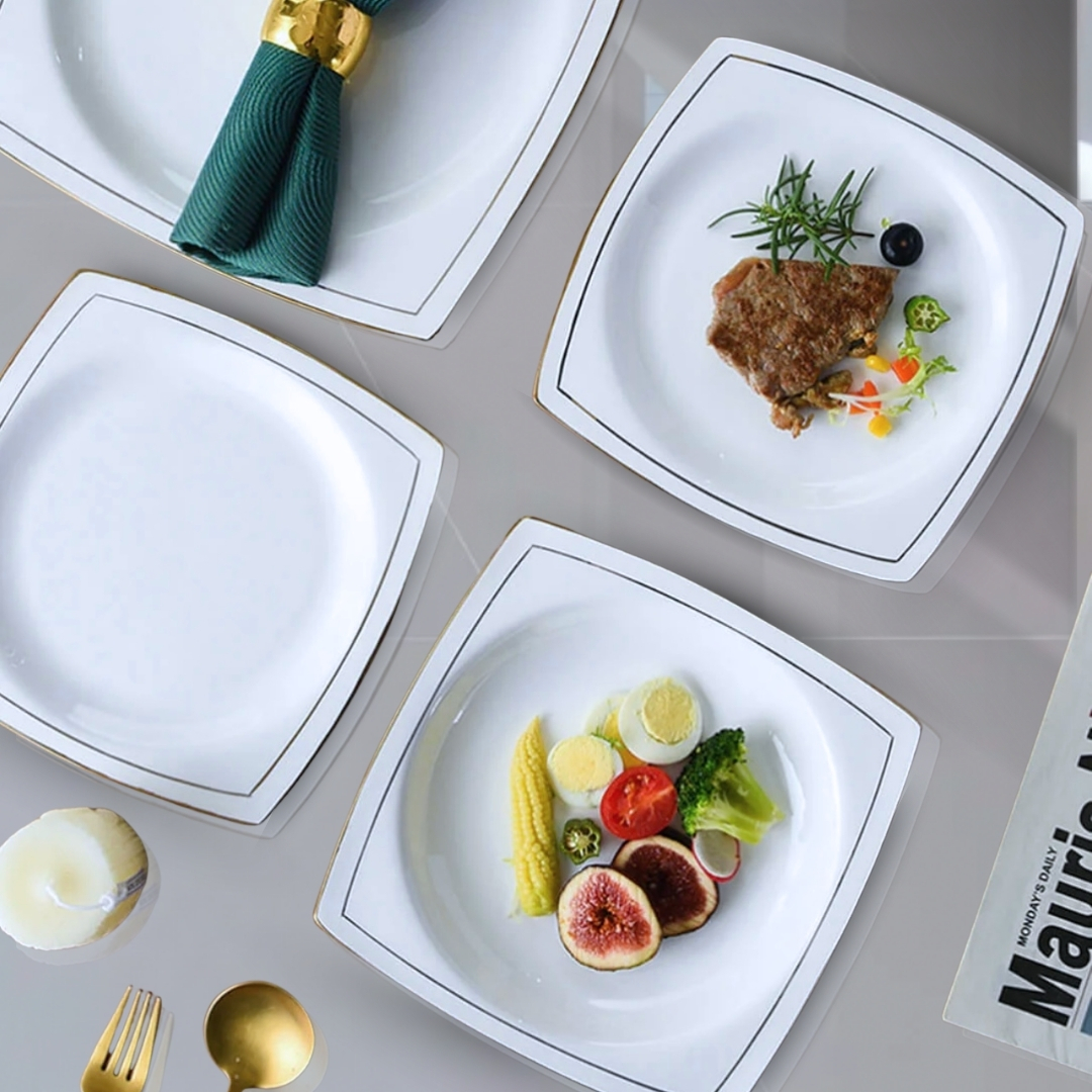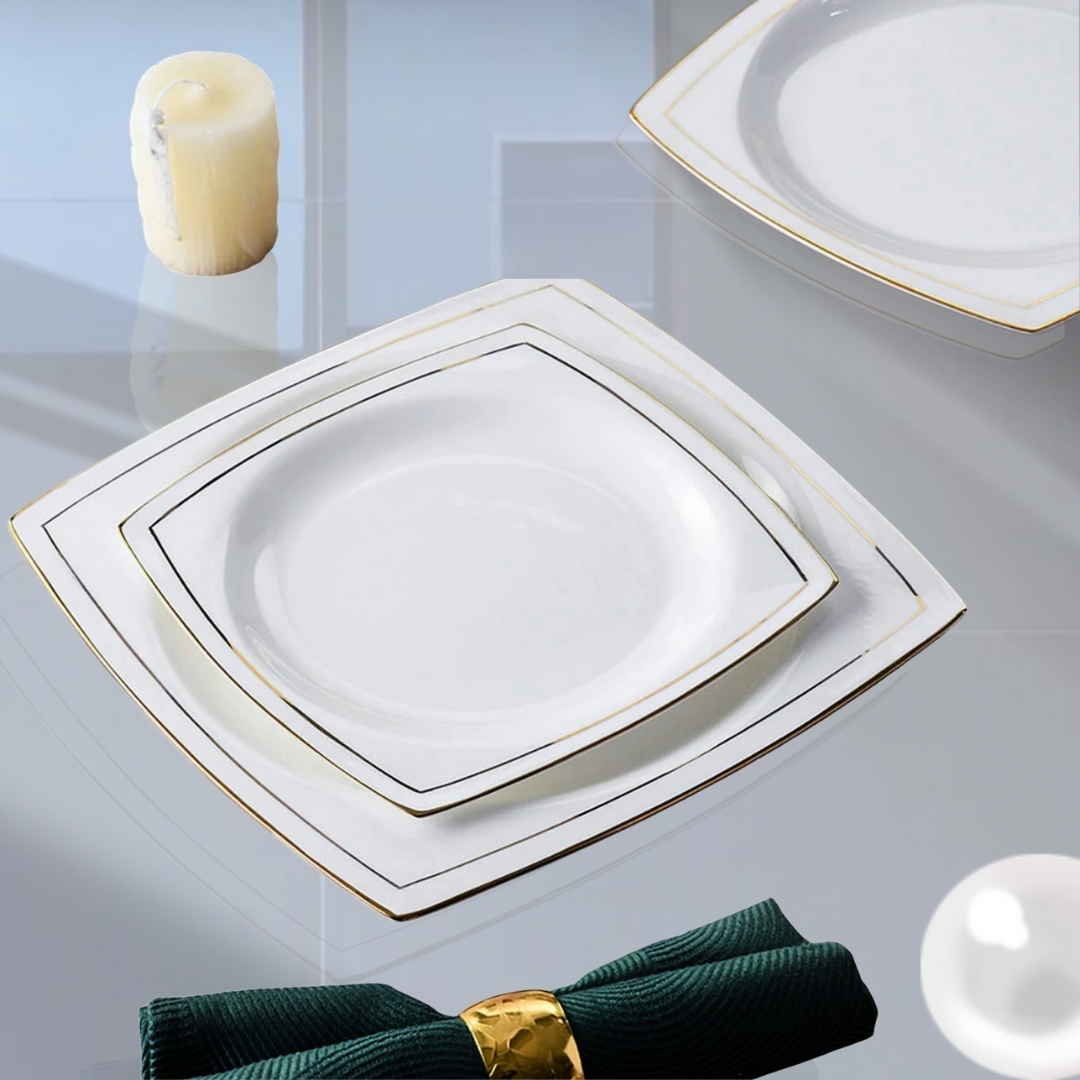 Understated yet elevated, the Pearl Essence dinnerware set is ideal for lovers of contemporary minimalism. The smooth white porcelain is accented with a delicate gold trim, and its rounded square shape adds a unique designer edge to the table