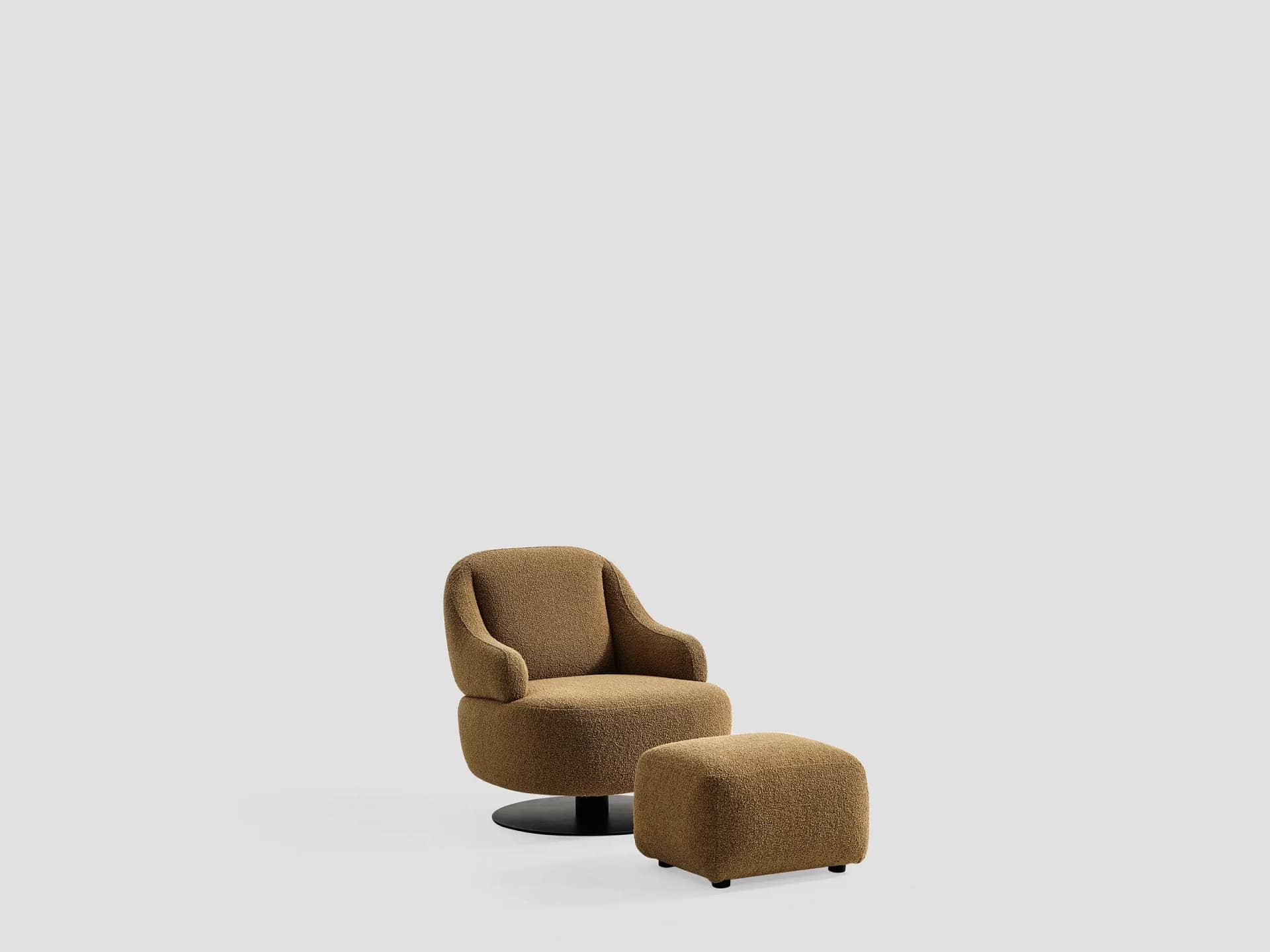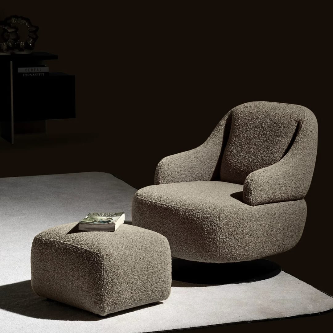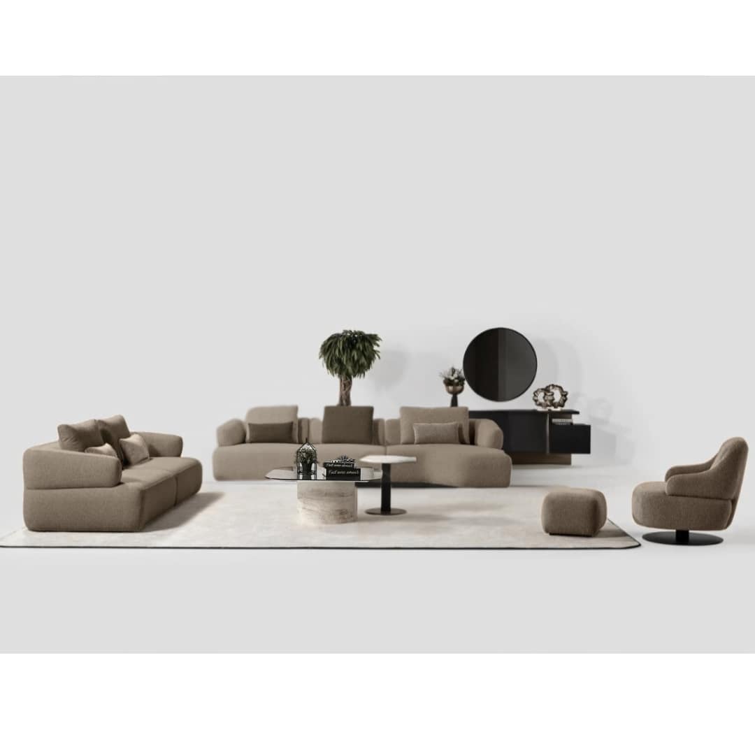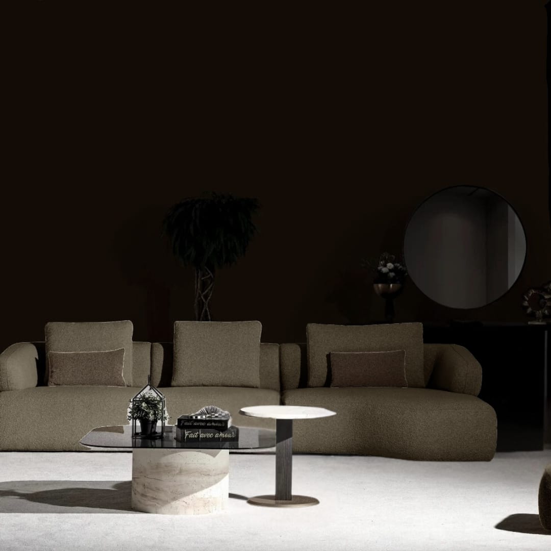 It also comes with an elegant armchair in a rich brown hue. It introduces texture and comfort, and creates an inviting focal point alongside the plush seating. This sofa set offers both style and function, making it perfect for contemporary interiors seeking a refined yet welcoming feel.