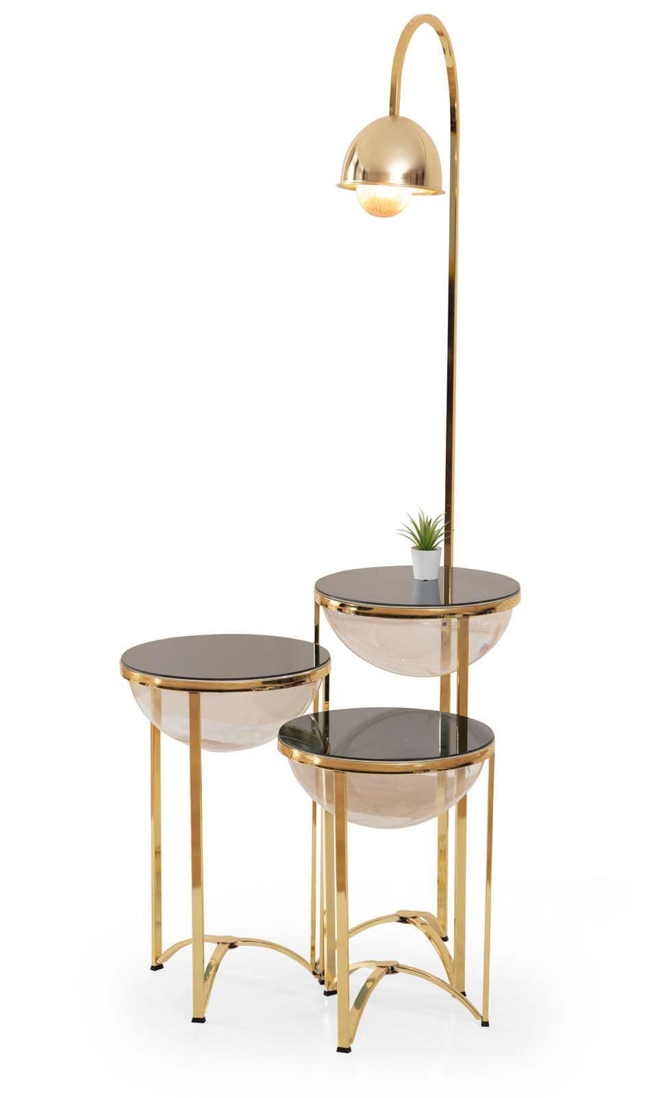 This unique piece cleverly combines functionality with aesthetic appeal. It features a floor lamp with an arched design that seamlessly integrates with a set of nesting tables. The minimalist gold metal frame and smooth circular tabletops create a modern and sophisticated look. The lamp’s gently curved arm holds a soft light bulb, providing warmth to the surrounding area in which it is placed in. The lower tables offer ample space for storage or decoration, while the overall design brings an elegant touch to any room. Ideal for a contemporary living space, this piece offers both illumination and style.