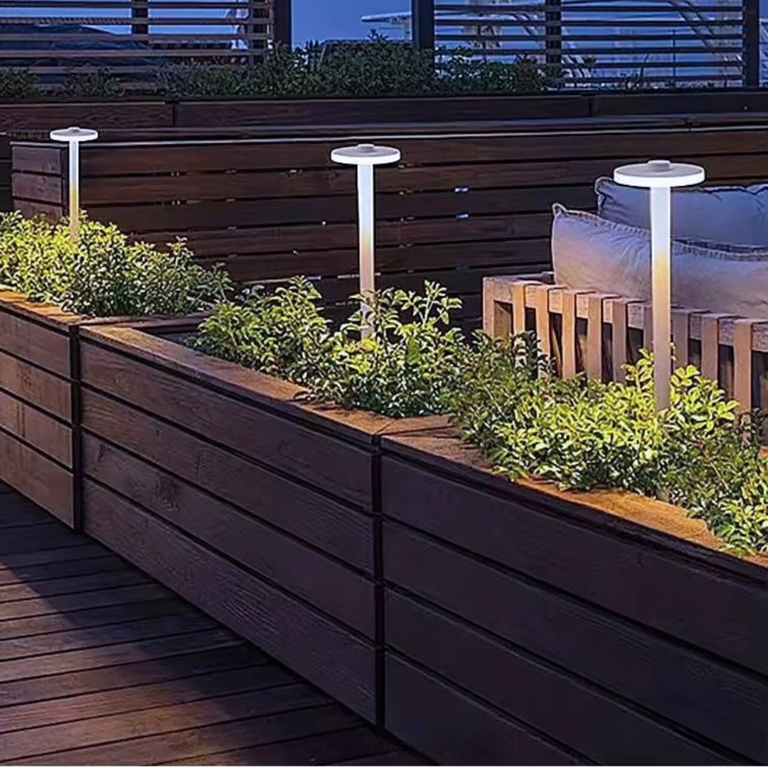 This sculptural floor light stands with grace, a bold blend of form and function. Its round, halo-like top emits a soft downward wash of light that is discreet, dramatic, and deeply modern. It is ideal for pathways, zen gardens, or minimalist landscapes
