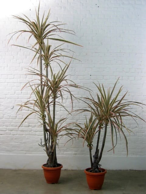 This piece features two tall dracaena plants in terracotta pots. Each plant features thin, spiky green leaves with accents of cream and pink along the edges, arching gracefully from the trunks below. It is a perfect option for tropical decor or large spaces.