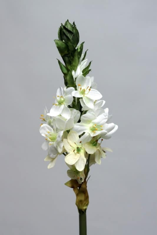 This single stalk features crisp white blossoms against deep green buds that exuding simplicity and sophistication. It’s ideal for minimalist or modern spaces and is well suited to be placed in tall, slender vases to enhance the vertical lines of a room