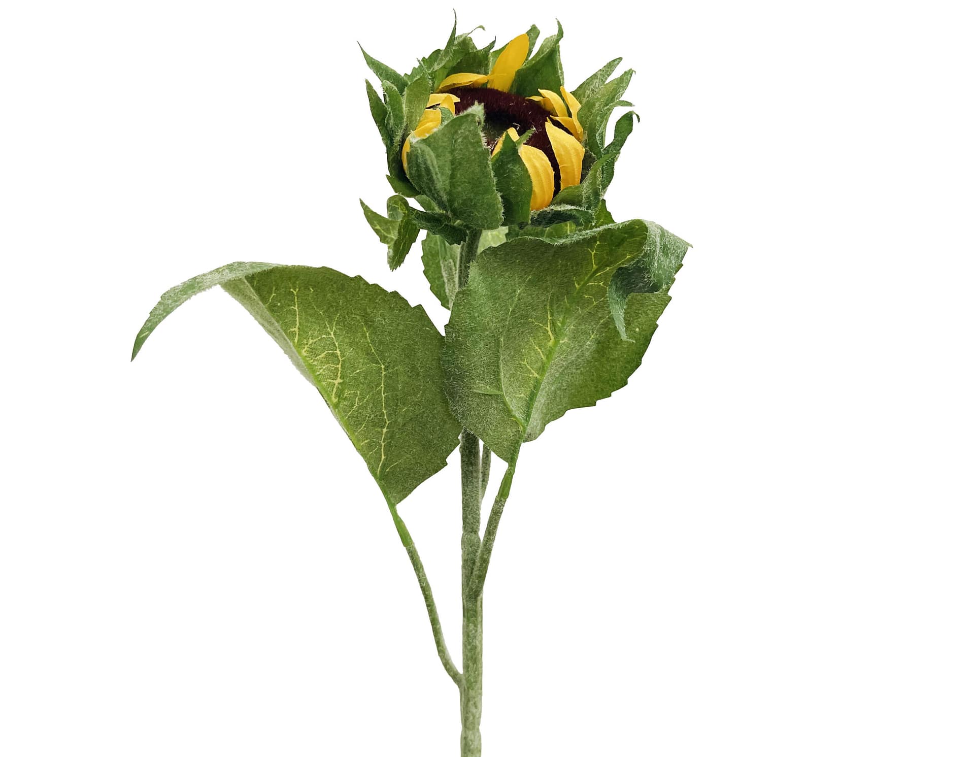 This realistic sunflower bud with vibrant yellow petals peeking through its green sepals, is accompanied by textured green leaves. It is perfect for adding a touch of nature’s growth and renewal to floral arrangements, bouquets, or standalone decor for rustic or sunflower themed settings