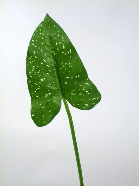 This artificial spotted alocasia leaf showcases a bold, tropical pattern that adds a unique touchy to floral arrangements. Its striking design is perfect for creating a tropical or jungle-themed setting. Use it as a decorative accent in your vases, floral arrangements, or table decor to bring a hint of nature indoors