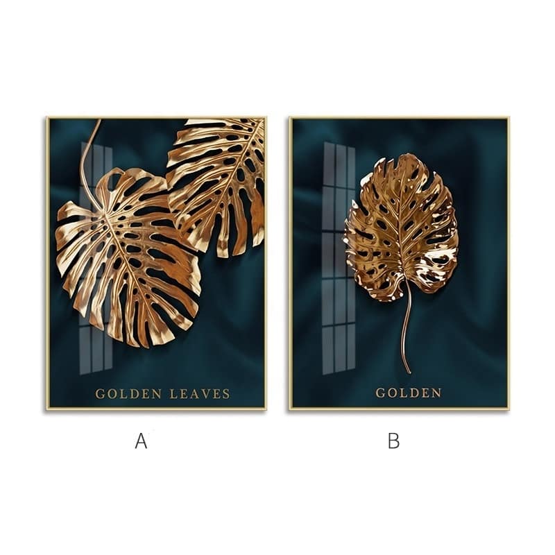 This painting features a pair of intricate golden monstera leaves that seem to emerge from a deep, rich teal background. The finely detailed leaves shine with a polished, metallic finish, highlighting their organic form against the smooth, soft texture of the background. The play of light on the leaves adds a three-dimensional effect, enhancing their natural beauty and elegance.