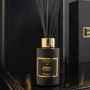 Reed Diffuser with highly absorbent rattan rods. With an elegant and sober format, it maintains the essential design of the collection in matte black with a gold finish. The distinction of the Salamanca district is transferred to this enveloping perfume with woody notes that makes it a warm and sophisticated aroma.