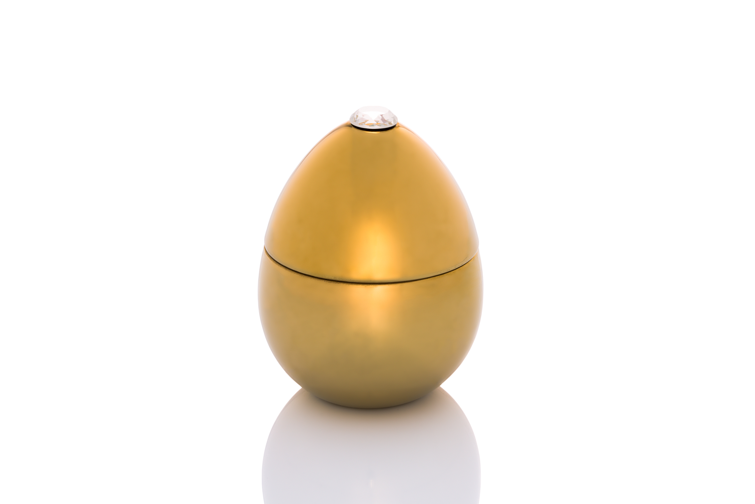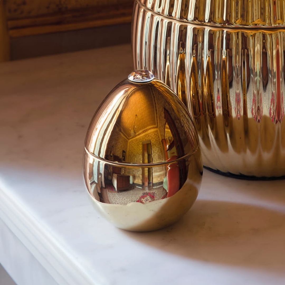 Aromatic candle designed in a plain golden egg format. A true work of art that impresses with its brightness, sober, sophisticated elegance and dream fragrance. Notes of sandalwood, nutmeg and a touch of petit grain. A jewel made candle ceramic vessel of 220 grams, carefully crafted with decorative stones and hand-painted.