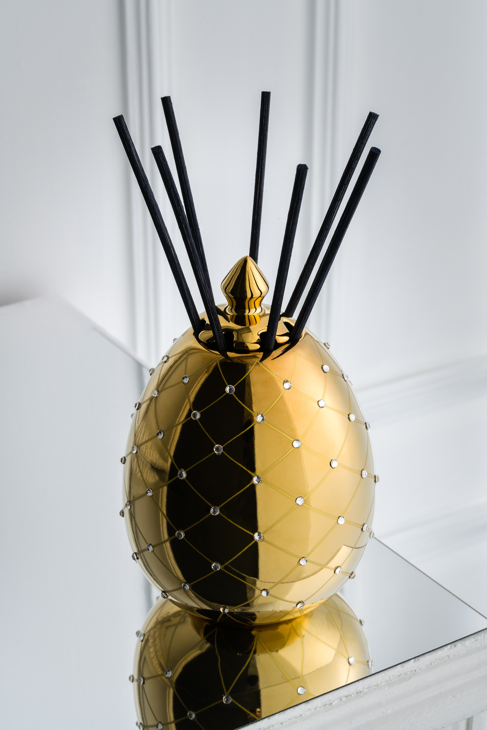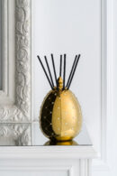 Luxury reed difusor, a piece of decoration and exquisite aromatization reed difusor made of ceramic in the shape of an egg. The gold color becomes the protagonist of this new format, with hot stamping printing and decorated with rhinestones, following the exclusive and elegant design line of this sophisticated collection. Reed Diffuser made of ceramic in the shape of an egg. The gold color becomes the protagonist of this new format, with hot stamping printing and decorated with rhinestones.