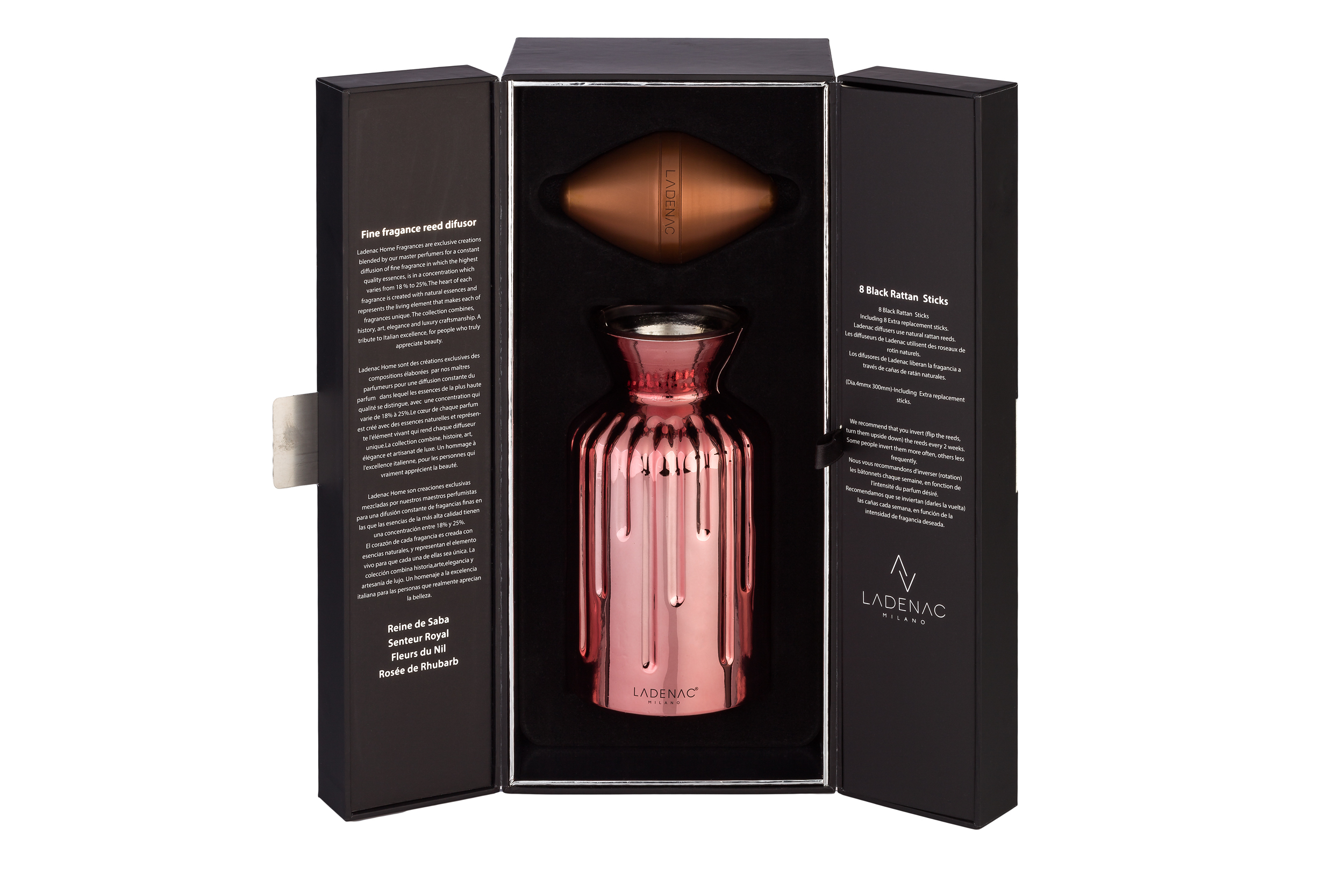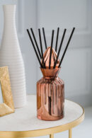 Fragance inspired with one of the female characters of the Old Testament. Reed diffuser version with a luxury box chest shape, the prevailing colors are rose gold and copper, like the King Solomon´s wife: feminine and elegant. Reed diffuser with powdery floral notes reed diffuser, the elegance of white flowers release the fragance of the warmth of sandalwood and the softness and sensuality of musk.
