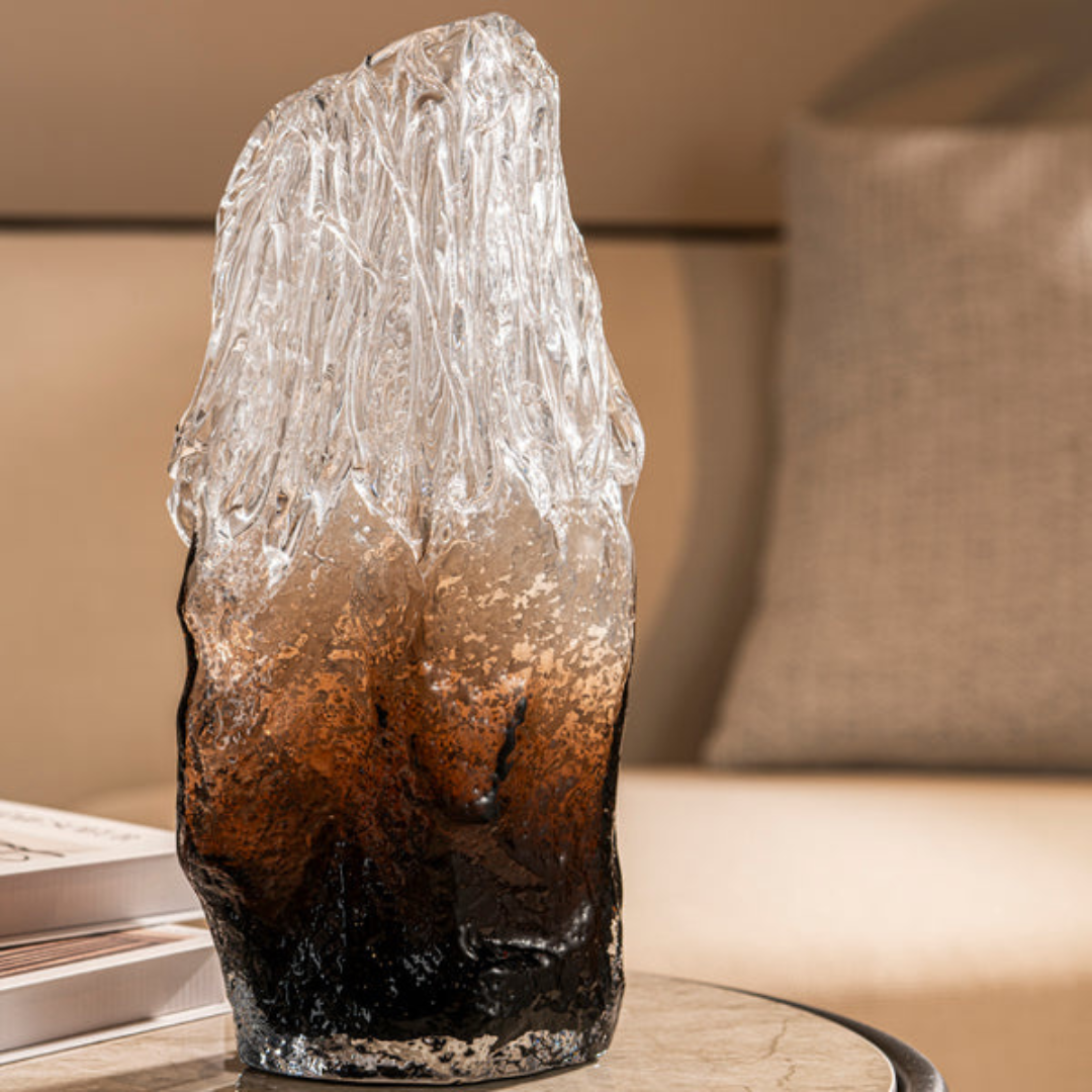 A striking two-tone glass vase featuring a frosted, ice-cracked texture that melts into a deep amber base. Sculptural, modern, and visually arresting.