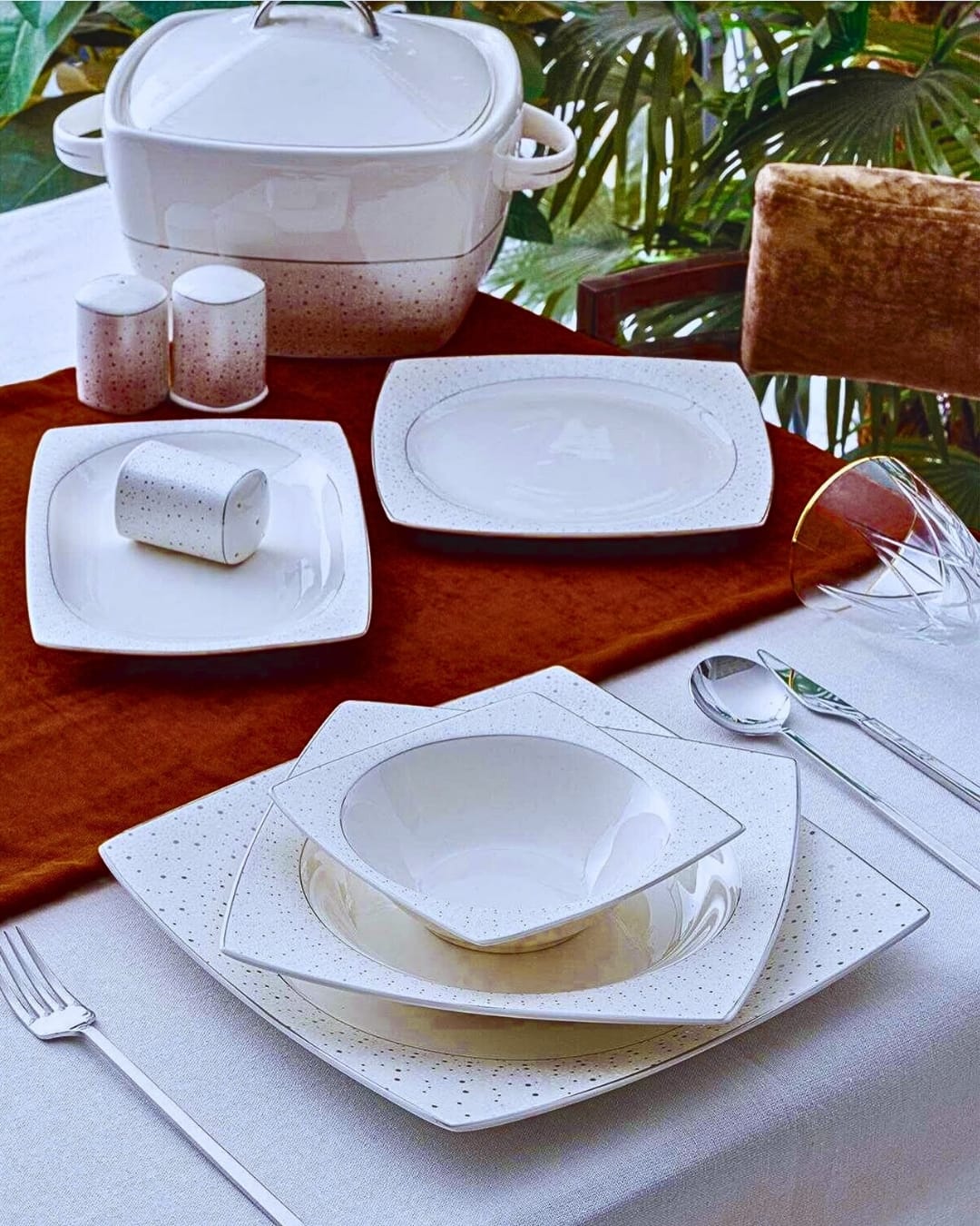 Where sleek form meets subtle luxury—introducing the Luna Moderne Dinnerware Set, a refined 60-piece collection crafted for the contemporary host. With its unique square shape and soft speckled gradient design, this set balances elegance with understated sophistication. The minimalist pattern, paired with gentle metallic accents, adds a modern yet timeless character to your dining table.