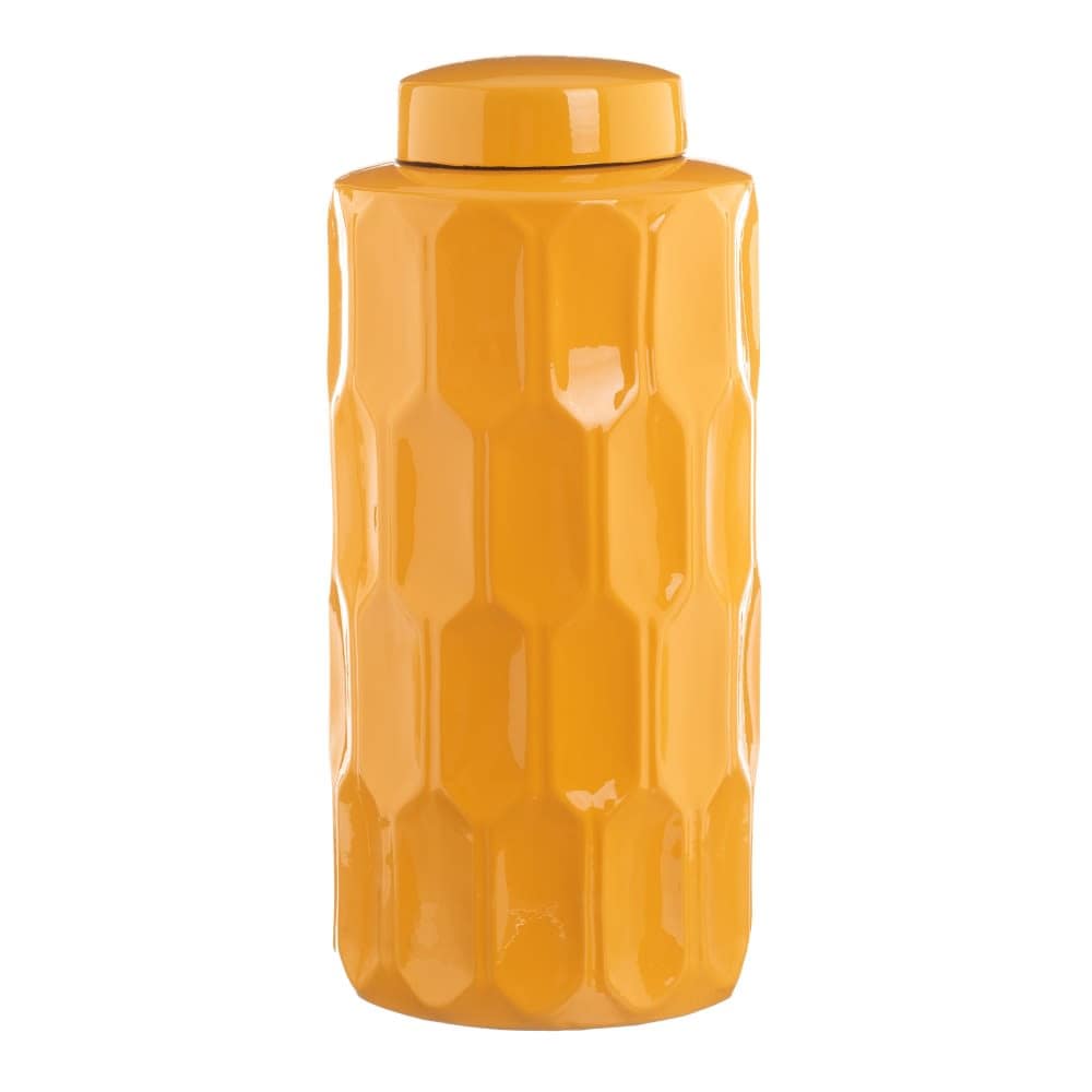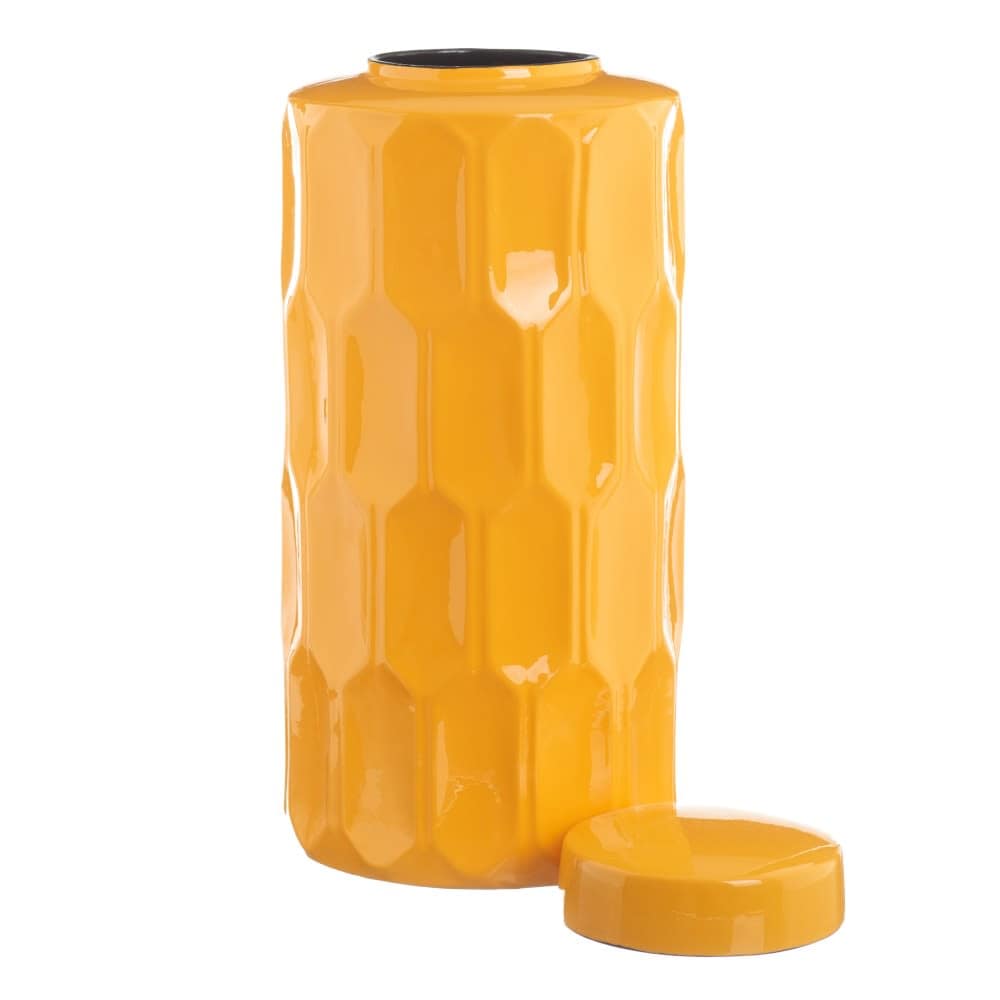 The bold, yellow of the Metuka vase is made out of premium quality ceramic and has a smooth, glossy finish. Its honey-comb-like pattern adds a tactile quality to it, alongside its fitted lid that sits flush with the cylindrical body. The Metuka vase is an eye-catching accent piece that would bring a pop of color to any room. It is also perfect for use as a decorative storage container or simply as a standalone statement piece on shelves or tabletops.