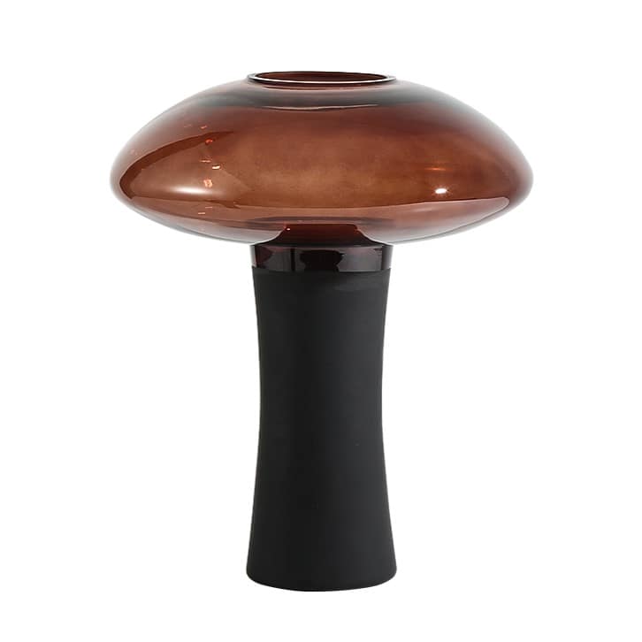 The Mushroom vase is a sophisticated piece that features a striking combination of shapes and finishes. Its glossy, black, cylindrical base provides a strong foundation that supports brown, rounded glass that adds warmth and opulence to its aesthetic. The brown, flared neck at the top of it contrasts beautifully with the darker ceramic tone below it, creating a balanced and refined silhouette. The interplay of matte black and glossy brown gives the Mushroom vase a modern, sculptural quality perfect for bold, contemporary interiors