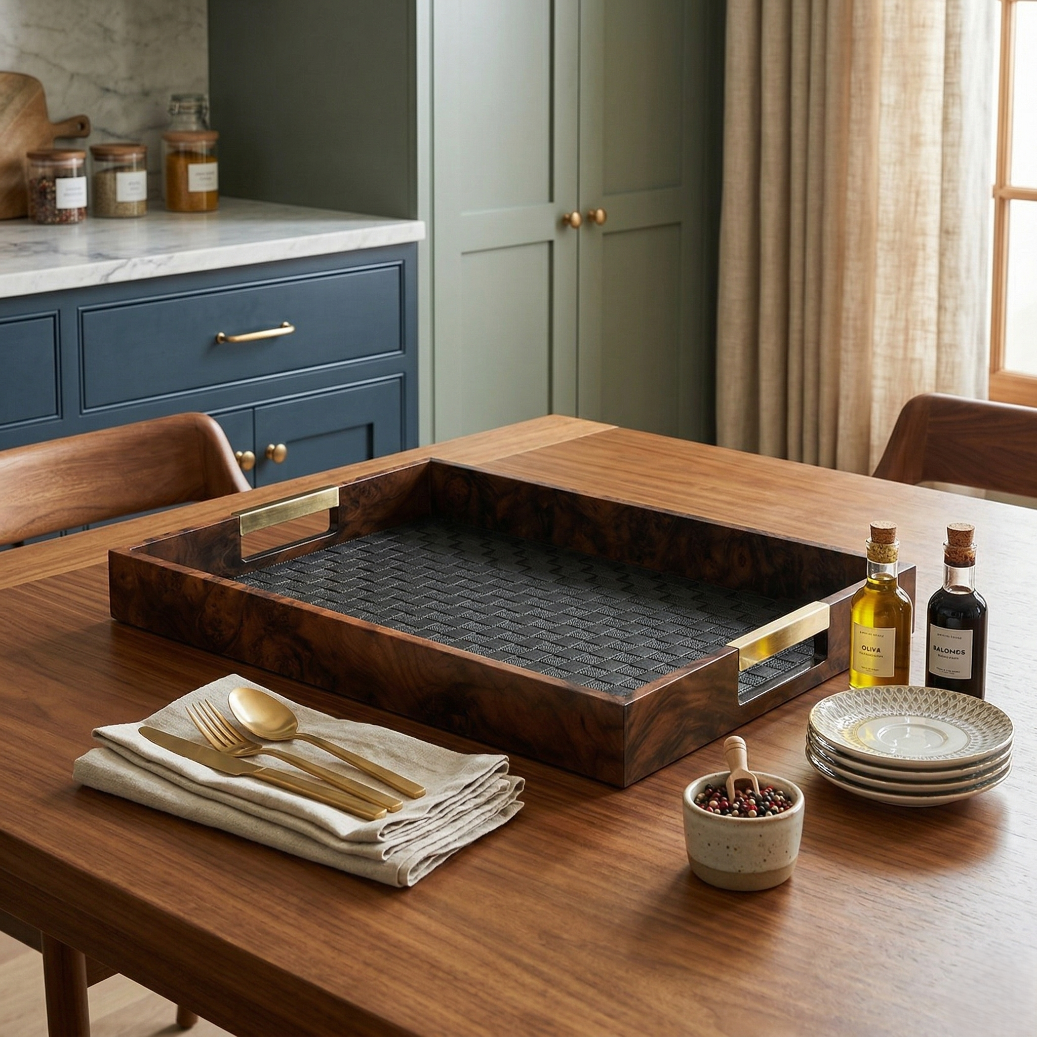 A structured square tray with dark woven texture and warm edges. Perfect for organizing essentials on a coffee table or dresser.