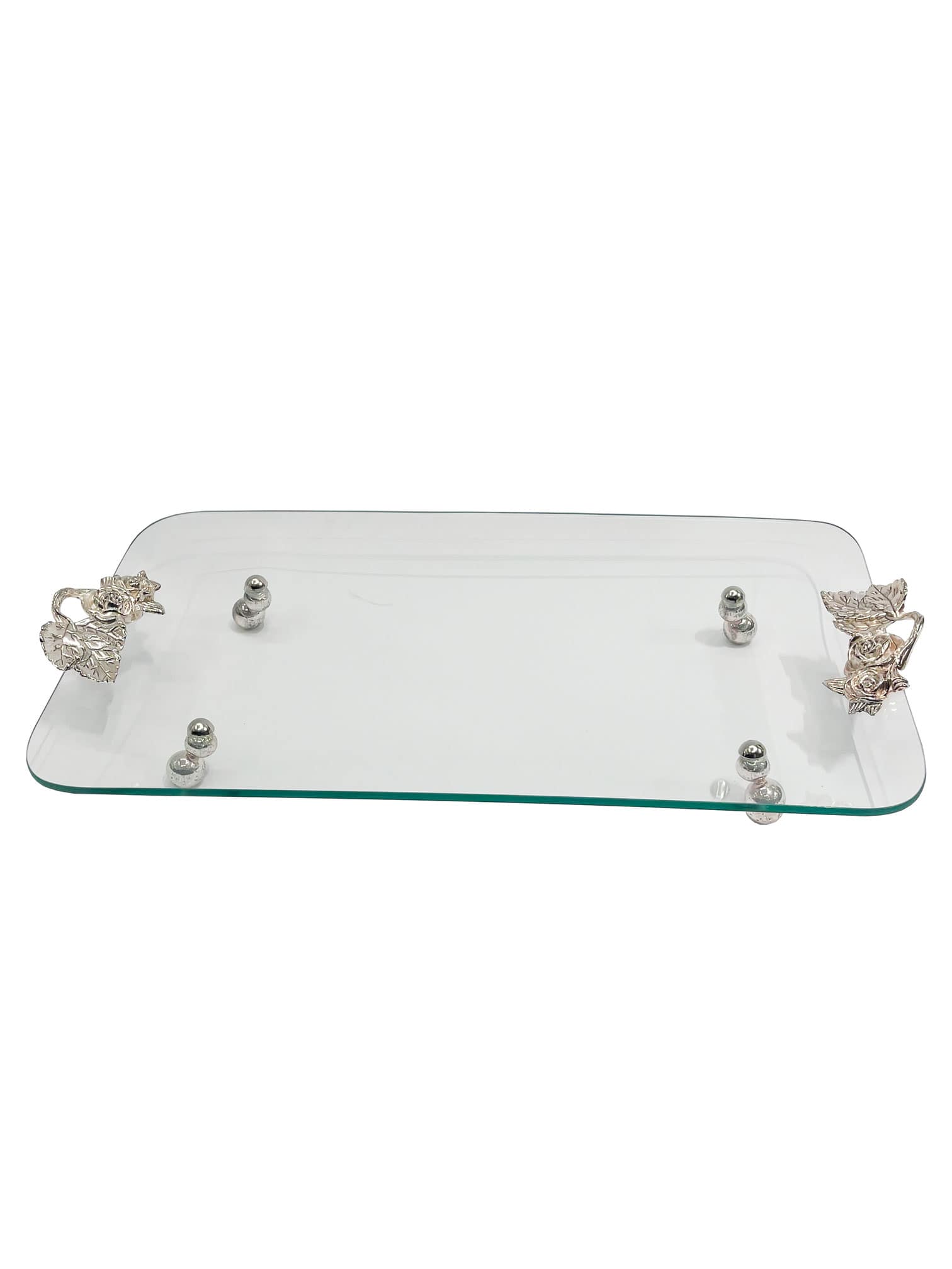 This elegant glass tray features a sleek, minimalist rectangular design with smooth edges. The clear glass surface gives it a modern and airy appearance, making it perfect for showcasing decorative items or serving purposes. The tray is supported by four decorative silver-toned clasps, each detailed with intricate floral motifs. The contrasting metal hardware adds a touch of vintage charm and sophistication to the overall contemporary design. This tray combines function with beauty, ideal for adding a touch of luxury to any tabletop or living space.