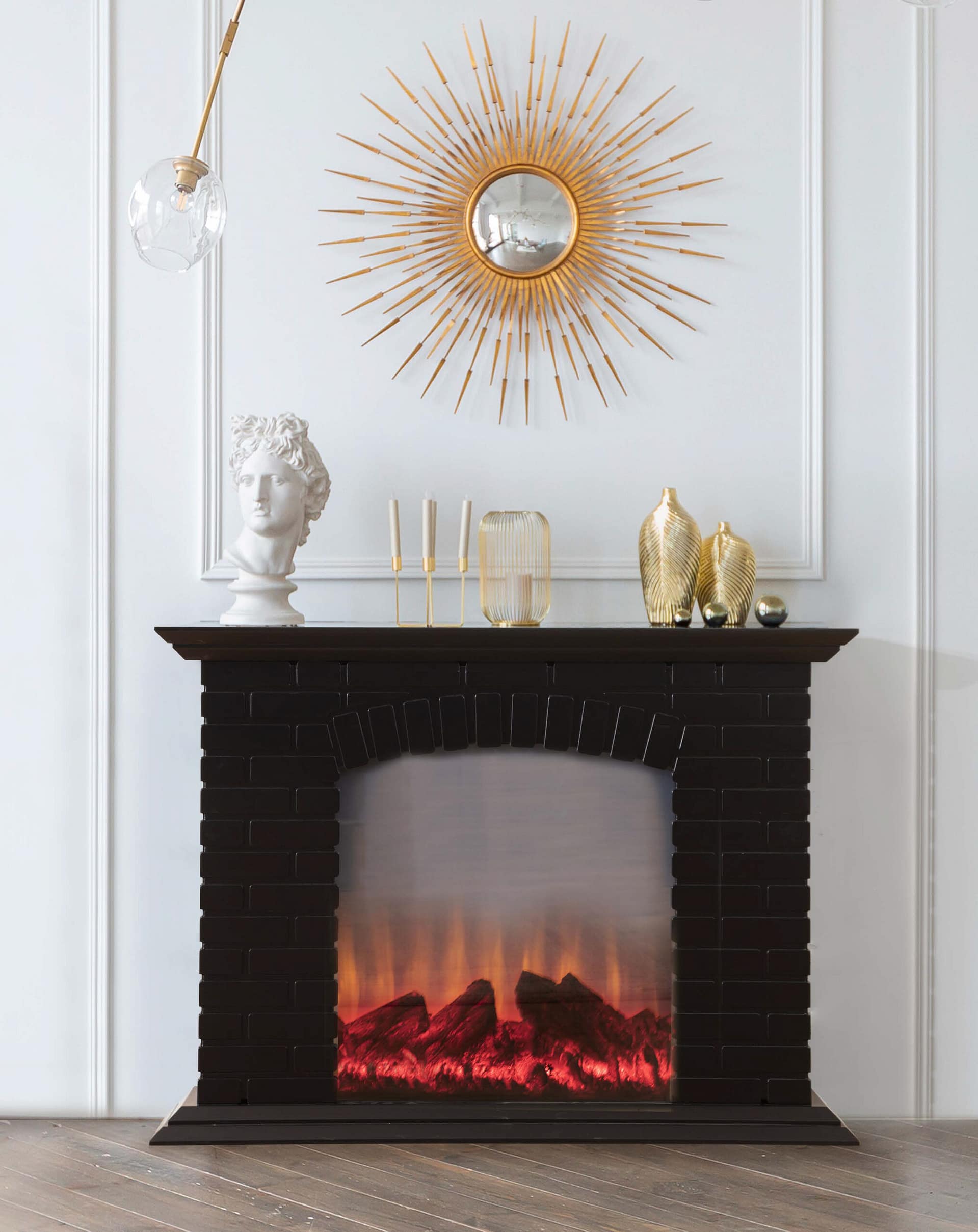 This beautiful fireplace offers a modern yet classic look. It features an archway design with black brick detailing and an LED flame effect that enhances the warmth and ambiance. The fireplace blends seamlessly into contemporary spaces, especially when accented with elegant decor items like the gold accents in the surrounding wall decor, which includes a mirror with a radiant sunburst design, that helps elevate the room’s overall aesthetic.