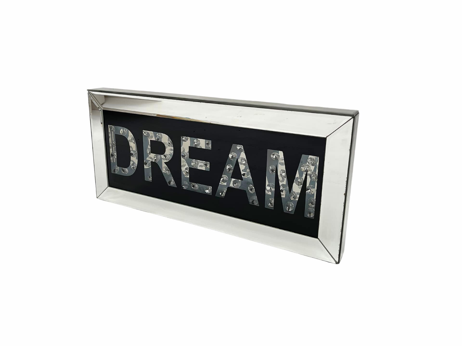 This piece features the word “DREAM” displayed prominently in an elegant design. The word is set against a black background, with a metallic/mirrored frame that adds a sleek and modern touch. This piece serves as a motivational reminder to always pursue one’s aspirations, and its minimalist style makes it a versatile addition to various interior spaces.