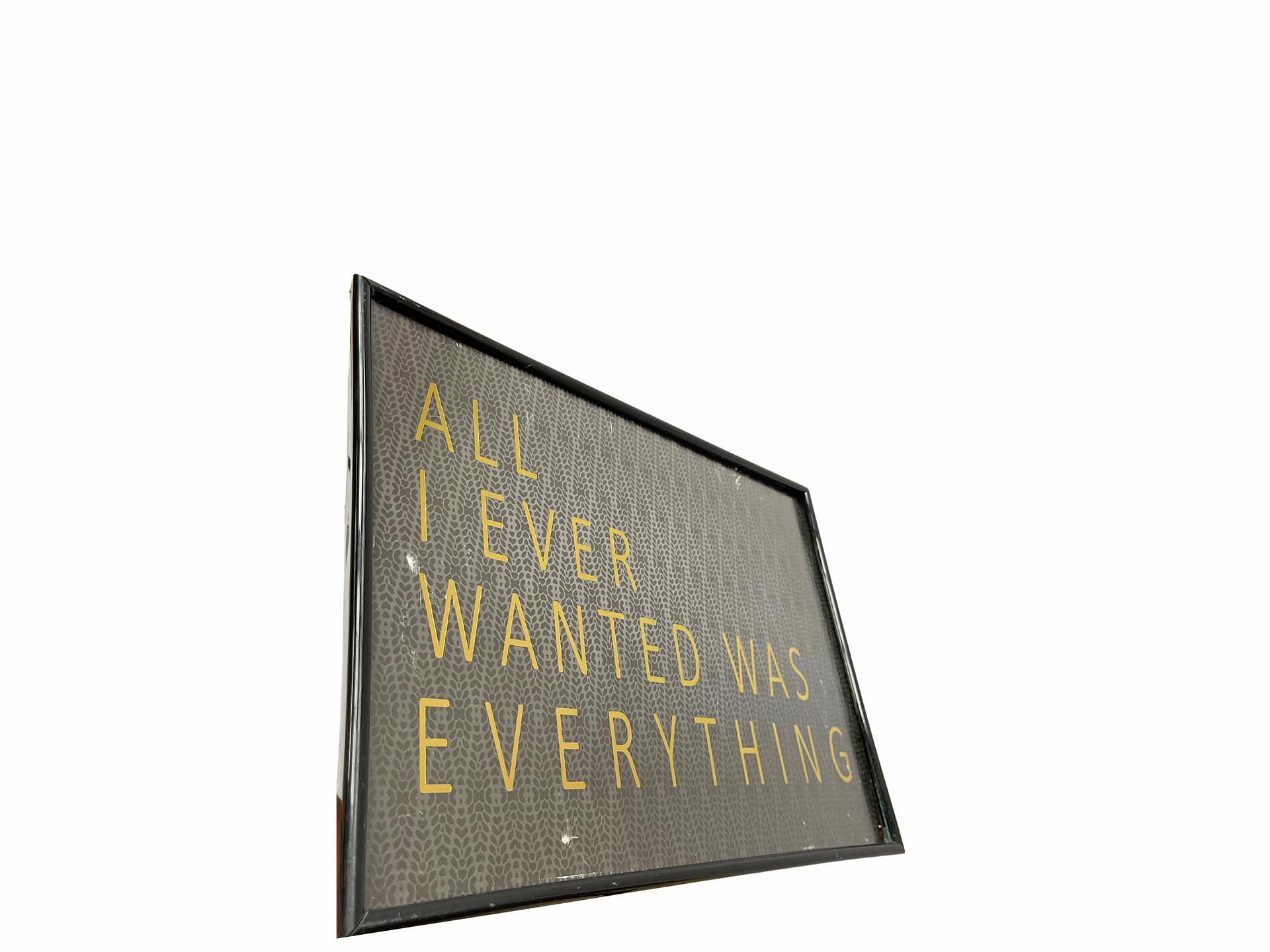 This piece showcases the phrase “ALL I EVER WANTED WAS EVERYTHING” in bold, golden text against a dark patterned background. The message makes it a striking and thought-provoking addition to modern interiors. The framed design adds elegance and makes it ideal for personal or professional spaces that appreciate minimalist and impactful decor.