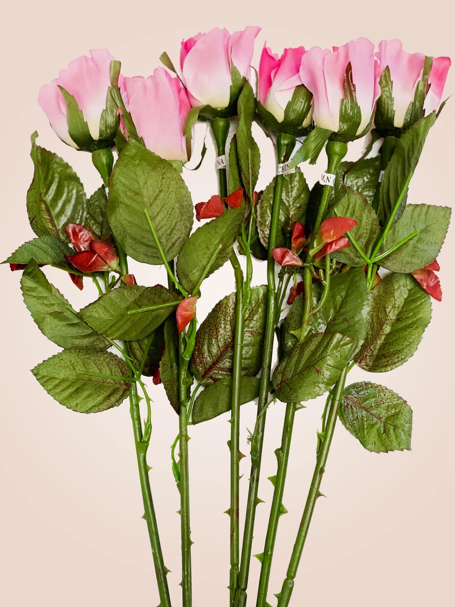These roses feature a mesmerizing gradient of colors, transitioning from a cool yellow at the base to a soft pink at the edges. The petals are velvety and full, their vibrant hues reminiscent of a romantic sunset. With glossy green foliage complementing the blooms, this arrangement captures a sense of passion and warmth, perfect for uplifting any setting.