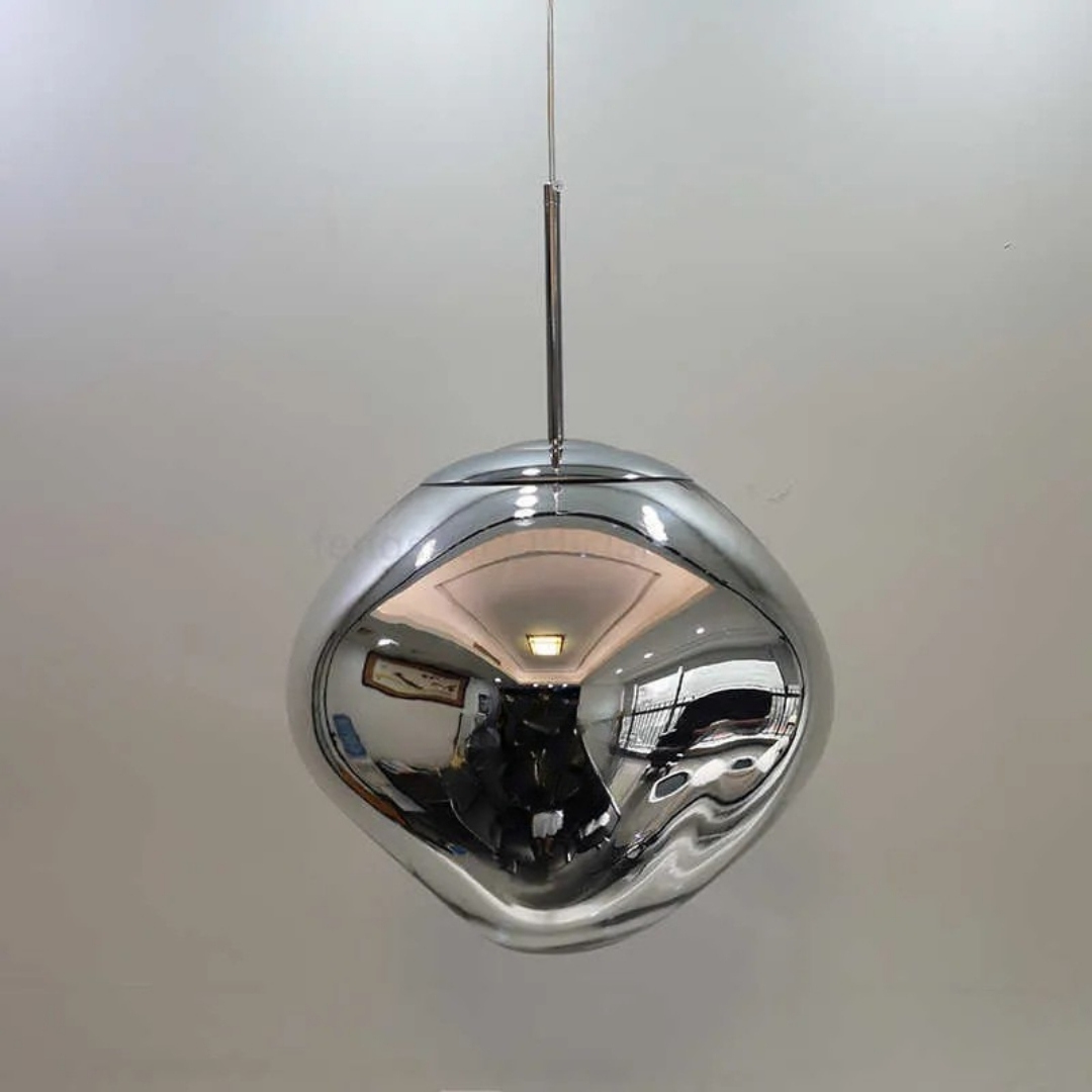 This dome pendant exudes futuristic luxury with a reflective, swirling chrome finish. The inner glow casts dynamic reflections that shift with ambient light, creating a mesmerizing visual experience. It is a statement piece that is ideal for hanging over dining tables or kitchen islands.