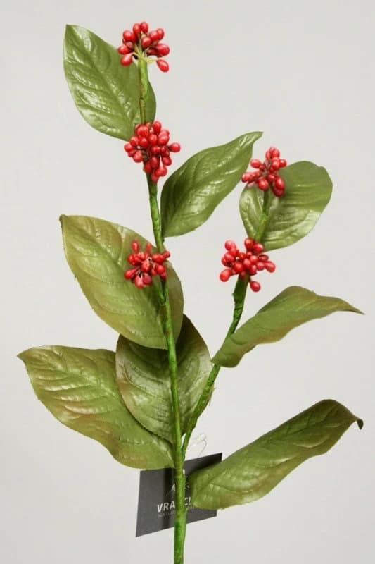 These stems feature clusters of small, red flowers that emerge from bright green leaves. The soft, organic texture of the flowers and leaves combines for a refreshing, spring-like appearance. The composition of this flower creates a lively and natural aesthetic, evoking a sense of harmony and peaceful growth.