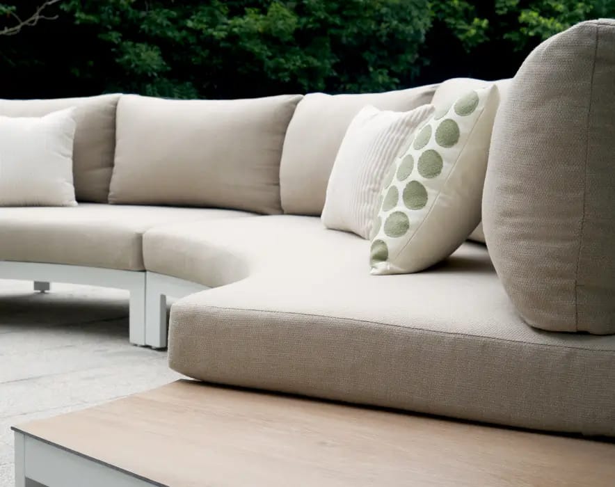 Our Ripple outdoor corner sofa set features a beautifully curved design that blends elegance with comfort, making it ideal for luxurious outdoor settings. Its contemporary appeal is accentuated by the neutral beige cushions that rest on its sturdy white frame. It is complemented by integrated wooden side panels and decorative throw pillows in subtle patterns that add charm and functionality to the setup, while the coordinating round coffee table completes the inviting setup. It is perfect for poolside lounging and its modular configuration ensures adaptability to various outdoor spaces thus enhancing the overall ambiance of your space with sophistication and ease.