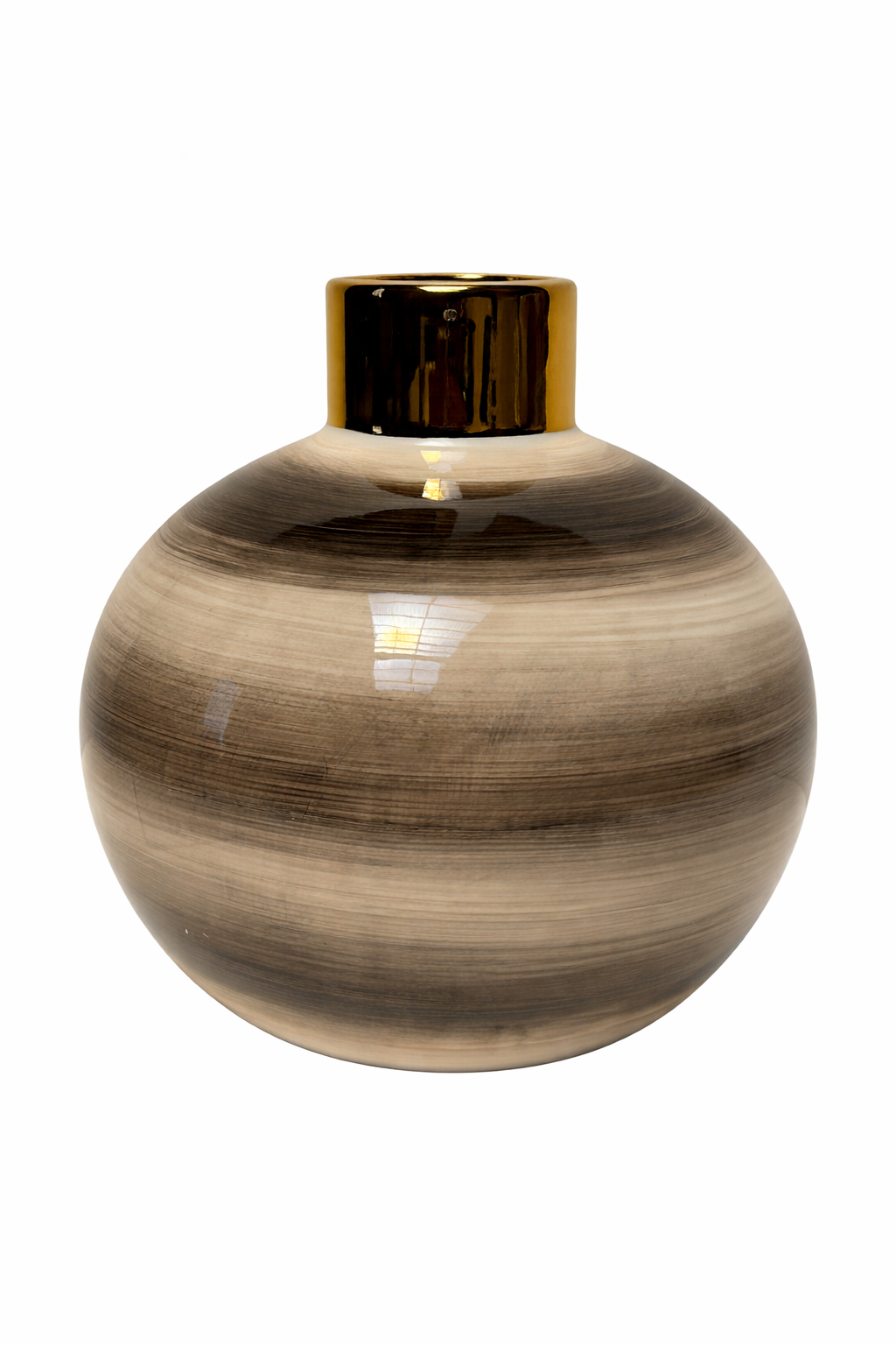 A rounded globe vase with soft, layered neutral tones and a polished gold neck—calm, elevated, and exceptionally easy to style. Its panoramic shape creates a grounded centrepiece moment while the gold finish adds the perfect touch of glamour.