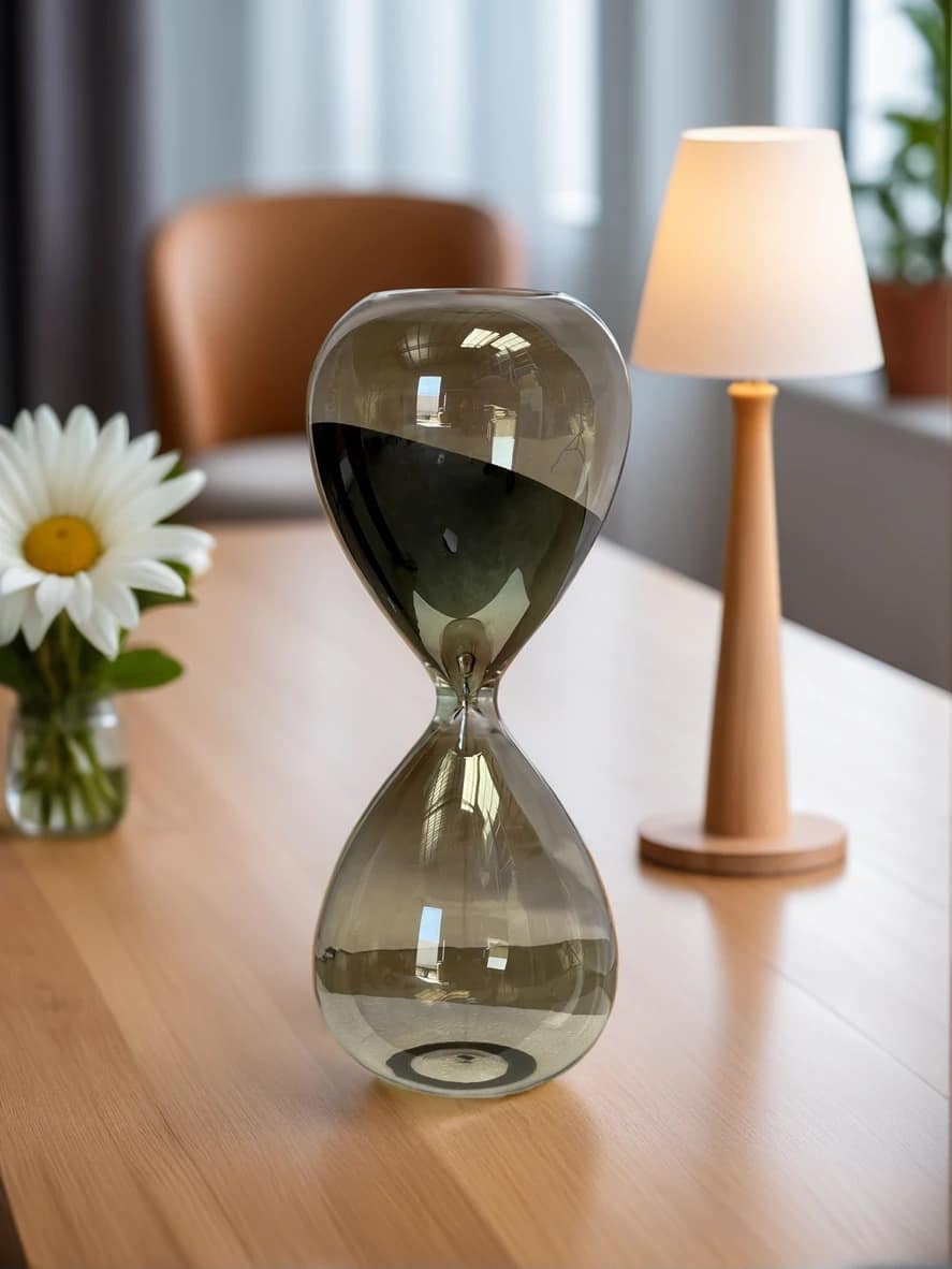 This striking hourglass sculpture features a seamless design where the diagonal flowing black sand is replaced by a unique gradient of grey glass, creating a modern twist on a timeless concept. The smooth, rounded curves of the sculpture draw attention to its hourglass shape, while the ombre effect adds an intriguing visual depth. The elegant finish and transparent quality of the glass capture the essence of time in a way that’s both functional and artistic, making it an exceptional decorative piece for contemporary spaces. The sand flows for 240 minutes