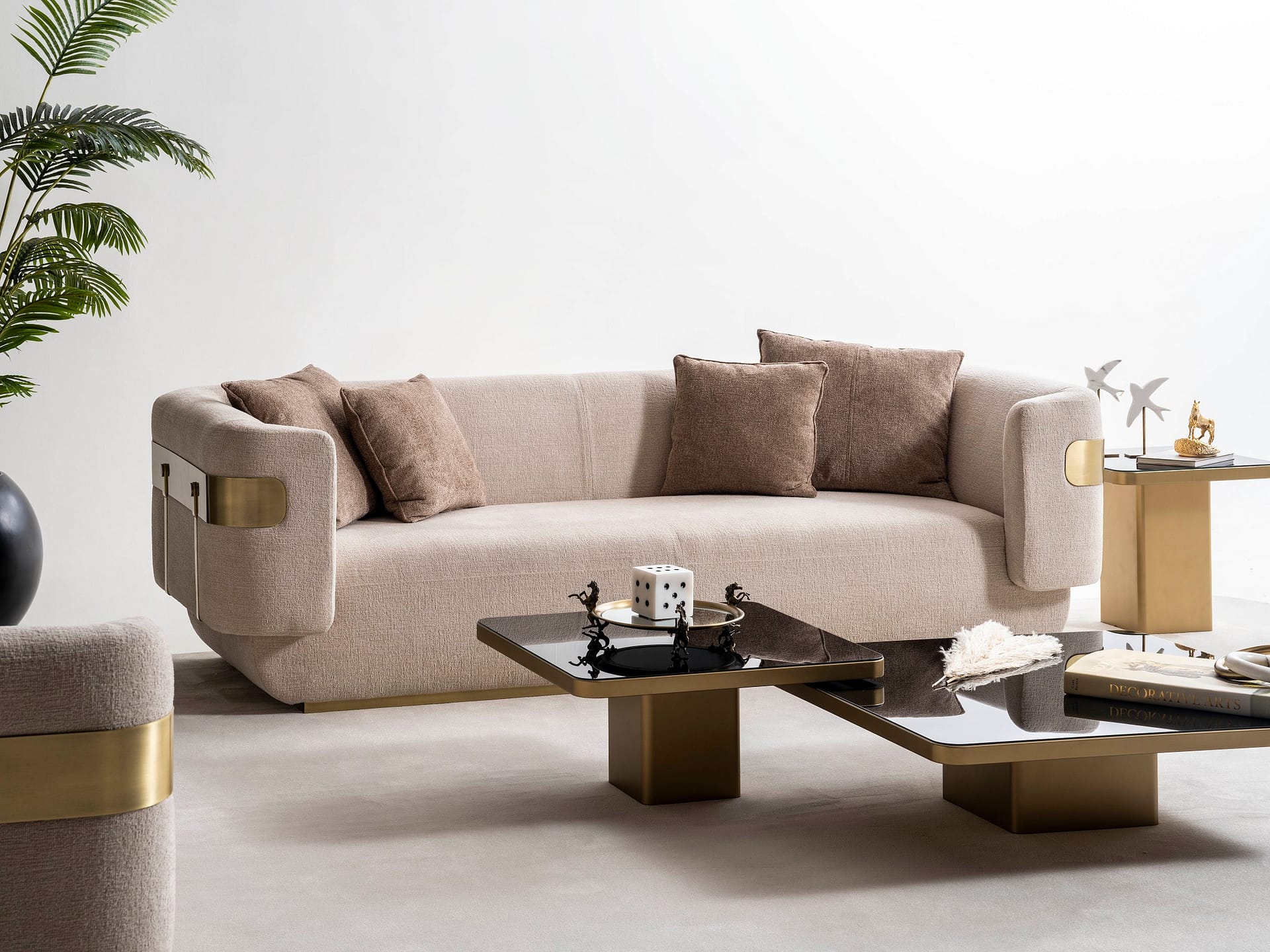 This sophisticated sofa set combines luxurious grey velvet upholstery with elegant golden accents. The pieces feature clean lines and a sculptural aesthetic, enhanced by the gold-toned details on the legs and frame. The plush cushions in soft tones contrast with the structured base, creating an inviting and balanced design that is perfect for interiors with contemporary styling.