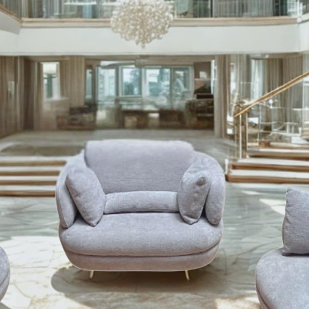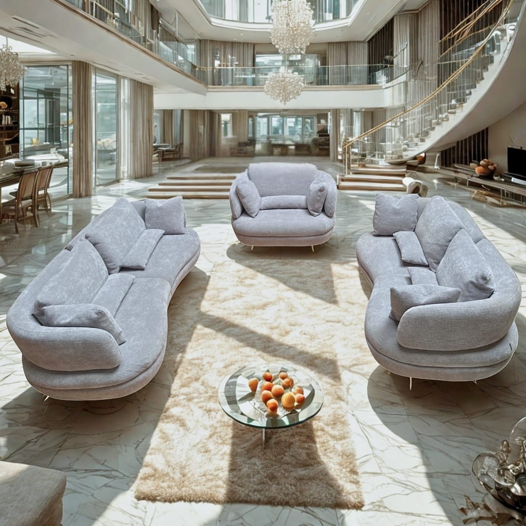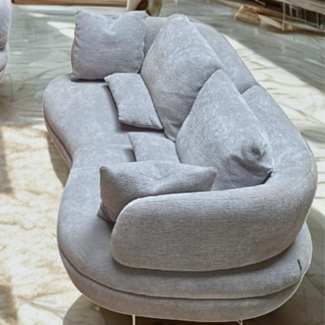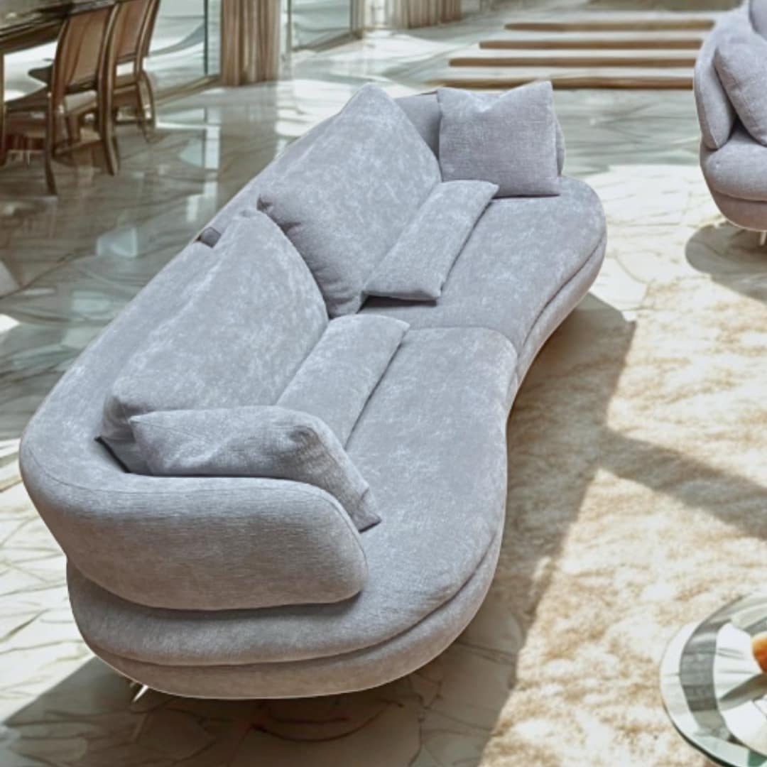This contemporary sofa makes a bold statement with its unique curved form and soft, silver grey leather upholstery. The clean, minimalist design is complemented by smooth, rounded edges that create a welcoming, organic shape. The sofa’s soft leather surface exudes luxury, while its seamless structure invites comfort and relaxation. Accented with contrasting throw pillows in green and burnt orange, it adds a pop of color and texture to the sleek, neutral palette. The overall effect is a stylish, modern seating solution that seamlessly blends artistry with function, making it a striking centerpiece in any living space.