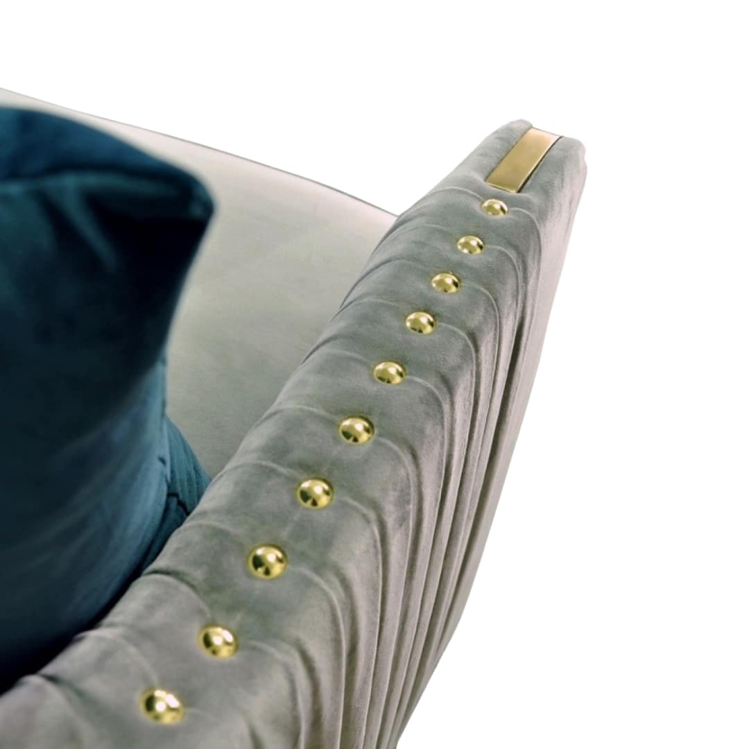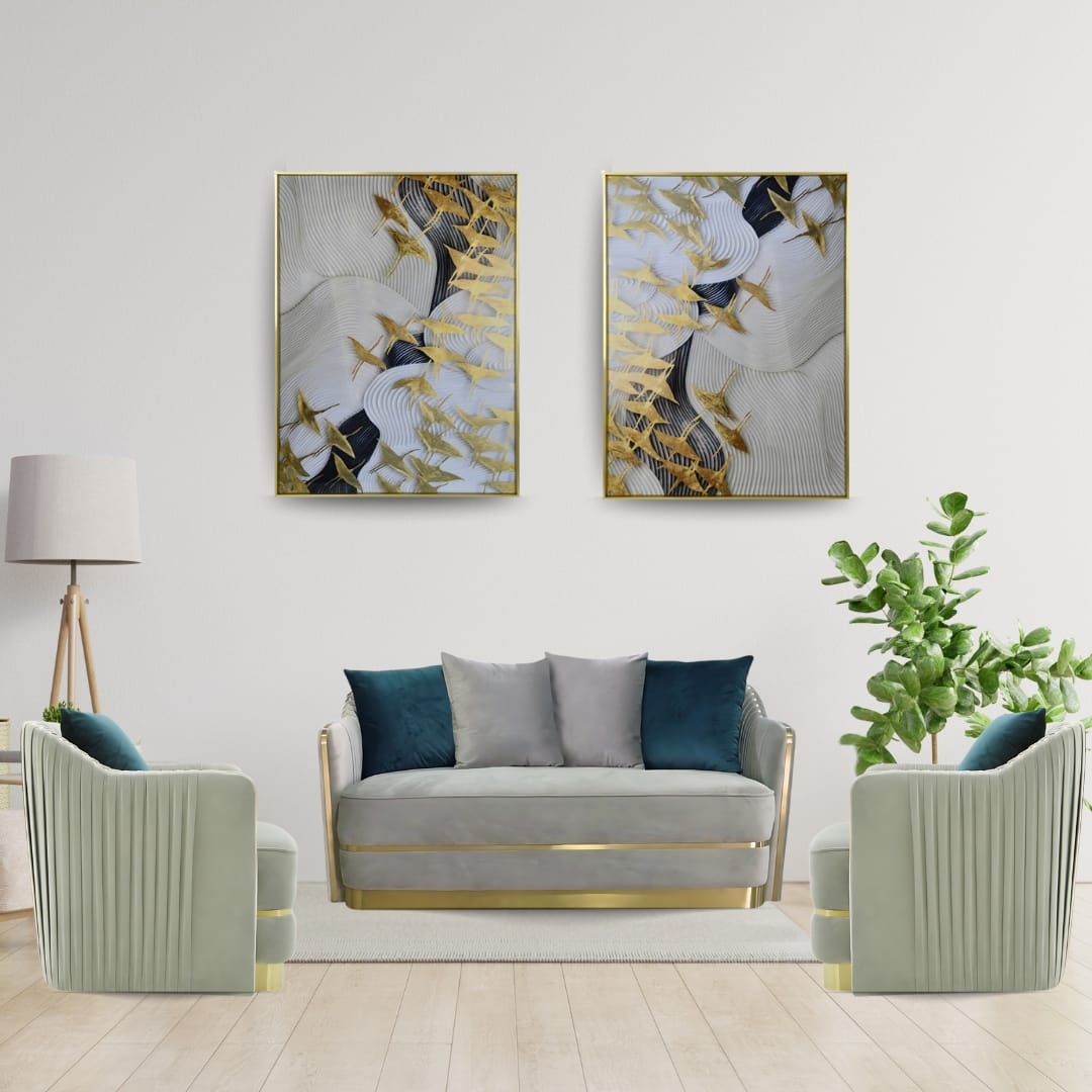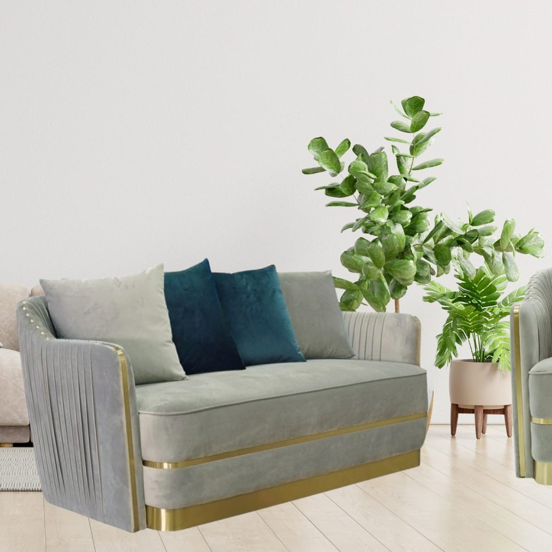 This elegant sofa set exudes luxury and comfort with its plush beige upholstery and sleek brass accents. The sofa set features a sculpted, wavy backrest that adds dimension and a modern touch. Four throw pillows in a variety of tones, including deep navy and soft silver, complete the look, offering both style and relaxation. The brass details on the arms elevate its design, giving it a refined, contemporary appeal. These piece would be an ideal addition to a chic, modern living room, blending functionality with a touch of glamour.