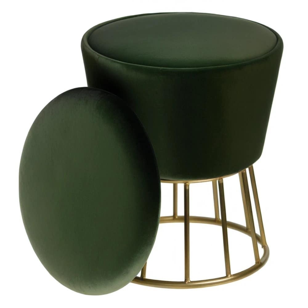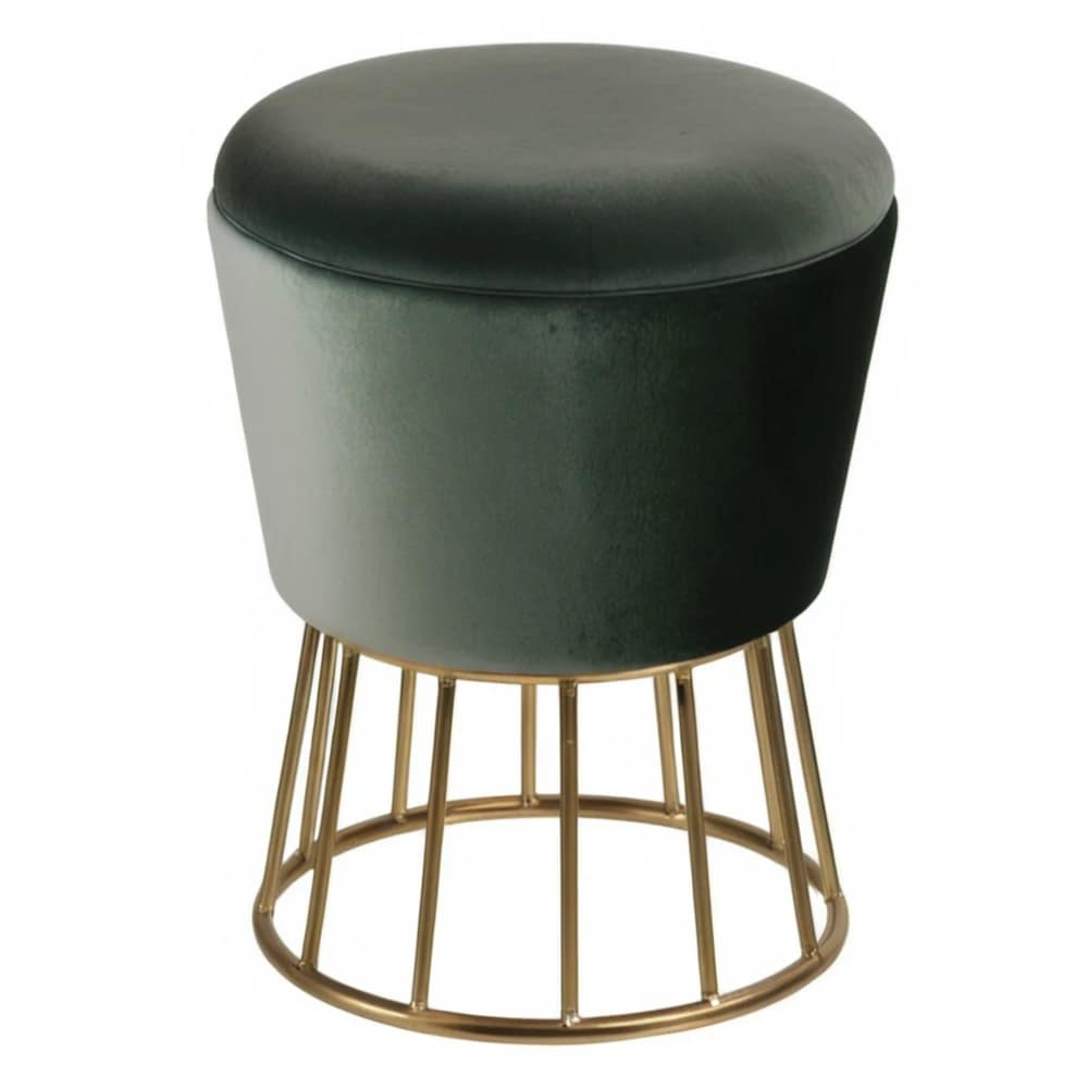 This stool showcases a modern and sophisticated design with its rich green velvet upholstery. The soft, plush texture of the velvet brings a luxurious feel to the piece, while its bold green hue adds a vibrant pop of color to the decor. The circular seat is complemented by sleek, slender gold-tone metal legs that form an elegant base, offering a nice contrast with the plush fabric.