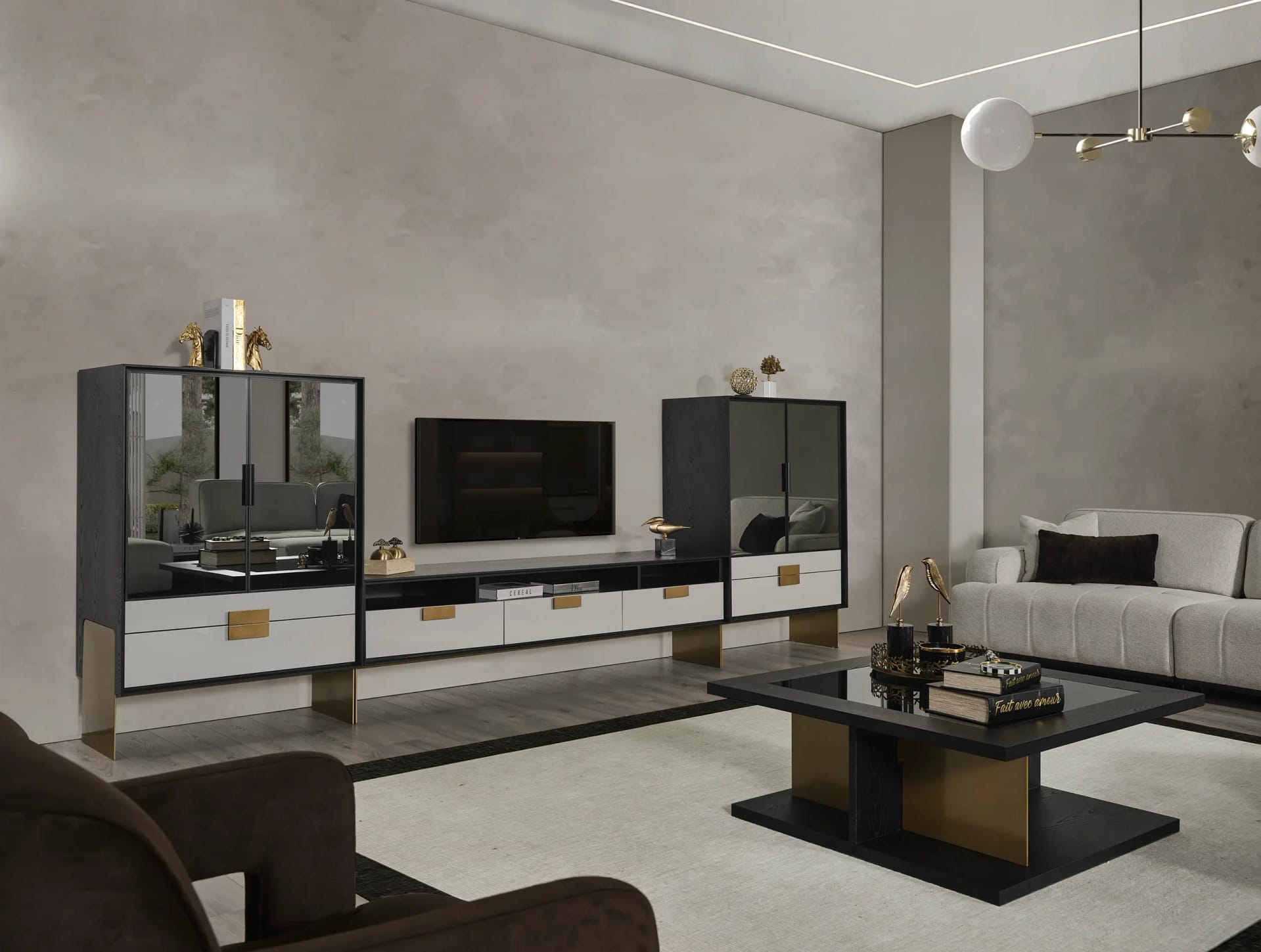 This sleek TV cabinet features a refined design, with a mix of glossy white and black finishes. The base showcases a luxurious gold-toned detail that contrasts beautifully with the matte black frame. A center drawer and two side cabinets provide ample storage space for media equipment and accessories. The integrated open shelving at the center ensures a streamlined and modern aesthetic, perfect for both contemporary and elegant living rooms. The glass-fronted doors enhance the storage units, allowing the display of collectibles or decorative items. The cabinet is supported by slim, polished gold legs that elevate the piece, giving it a sophisticated, airy look.