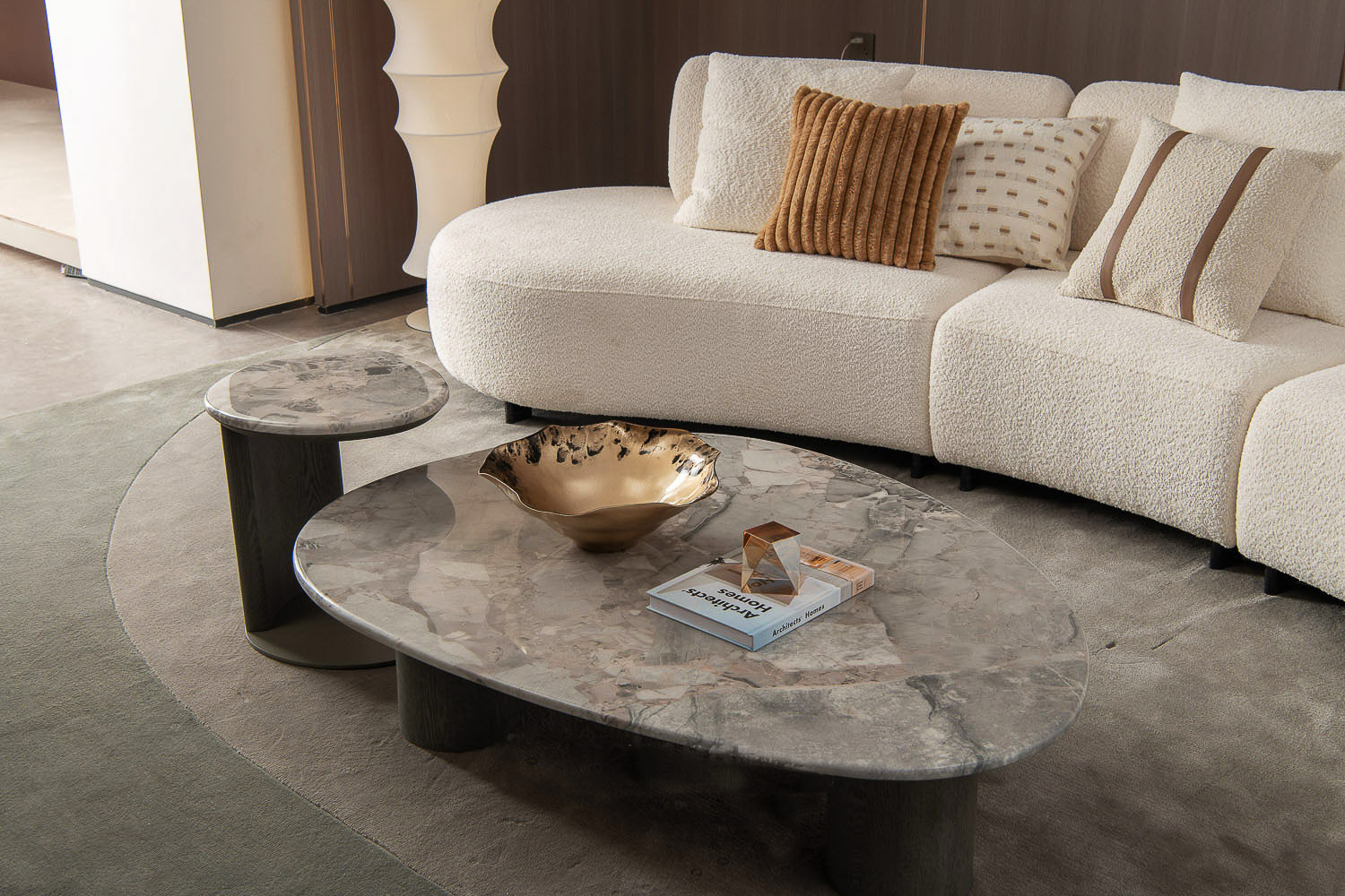 Perfect beside a sofa or lounge chair, it brings a refined blend of stone texture and minimalist geometry into any elevated living space.