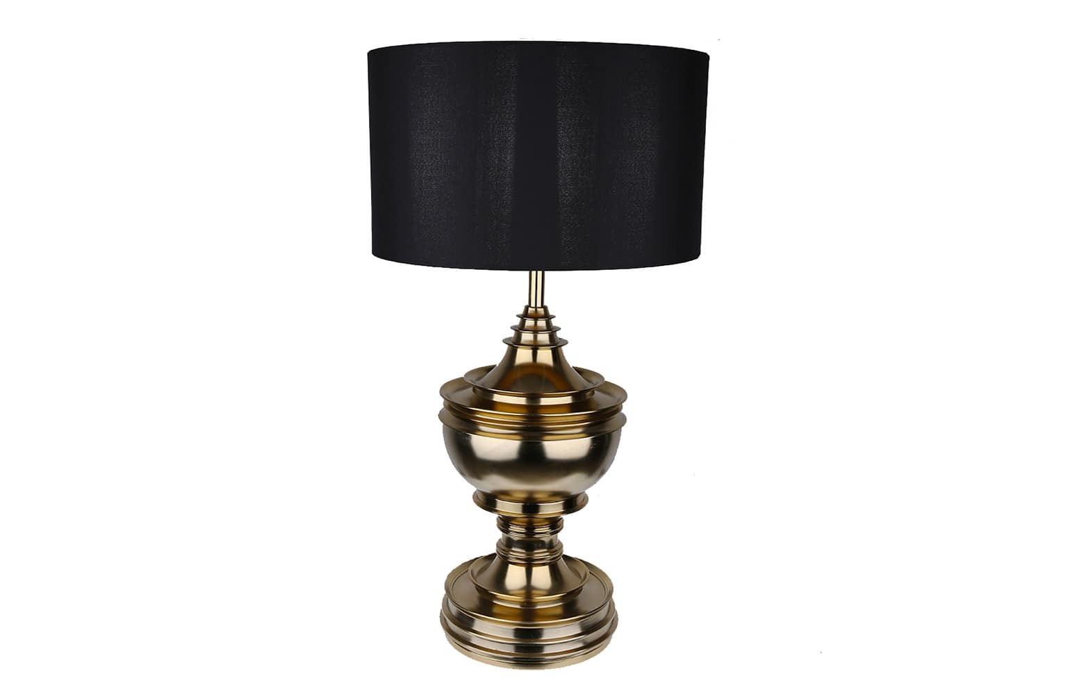 This elegant lamp showcases a polished brass urn-shaped base, characterized by its smooth, reflective finish and intricate detailing. The black fabric lampshade complements the luxurious metallic base, exuding an air of timeless sophistication. The traditional design combined with a modern sheen makes this lamp a versatile piece that complements various decor styles, from classic to contemporary.