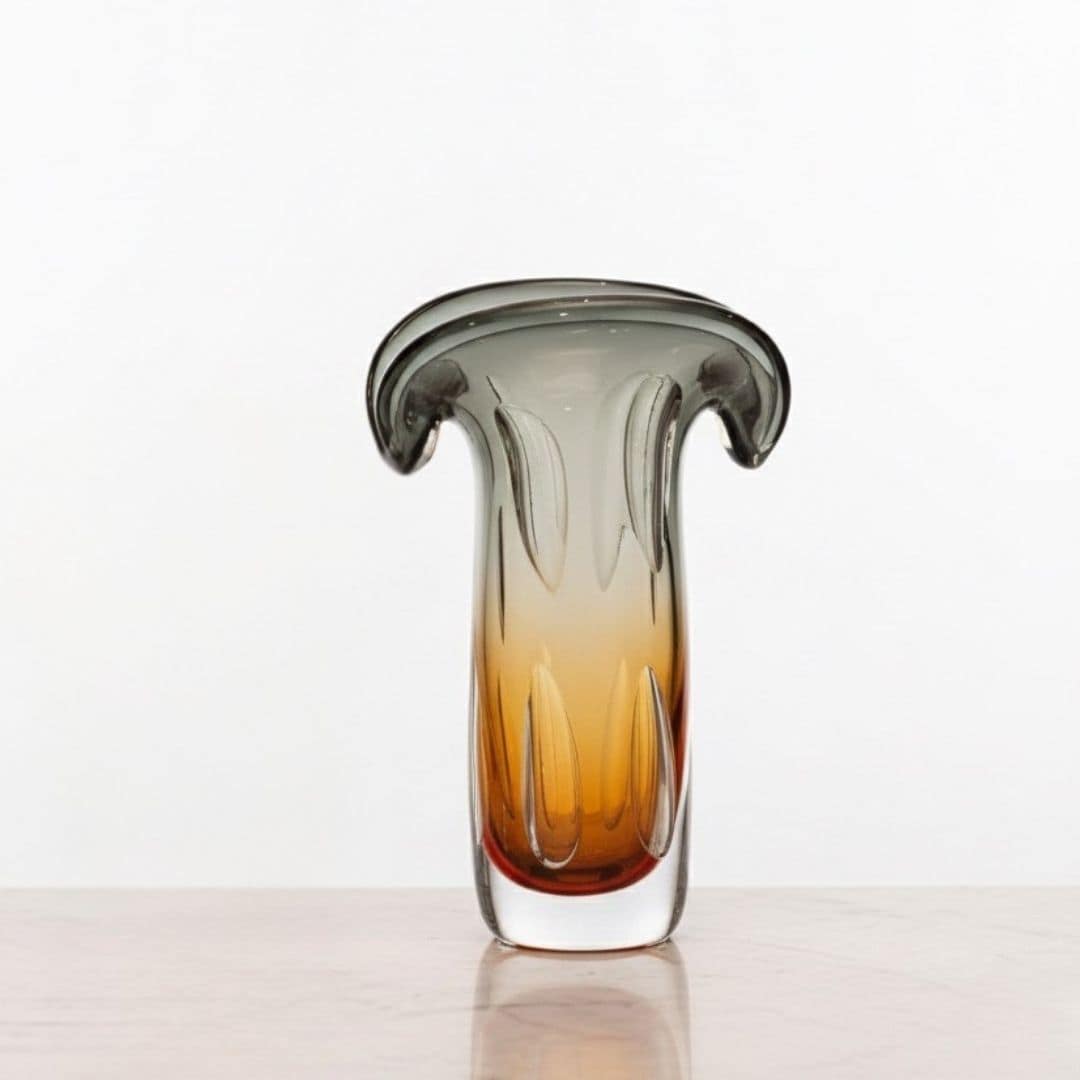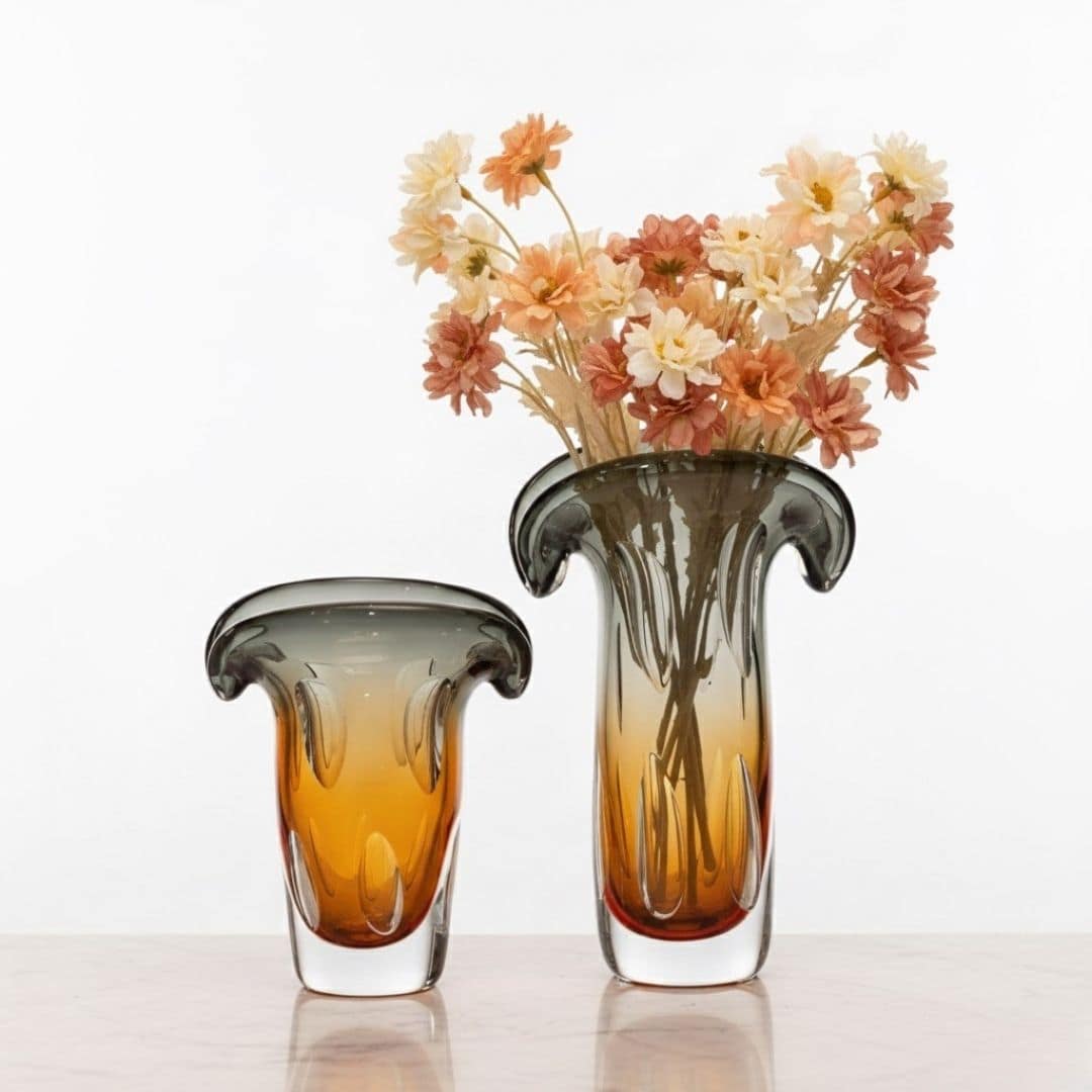 A sculptural amber-and-clear glass vase with a dramatic flared rim and petal-like cutouts. Elegant, eye-catching, and beautifully crafted.