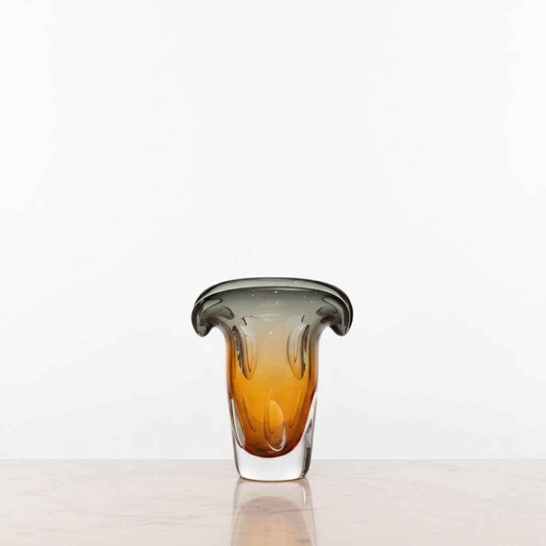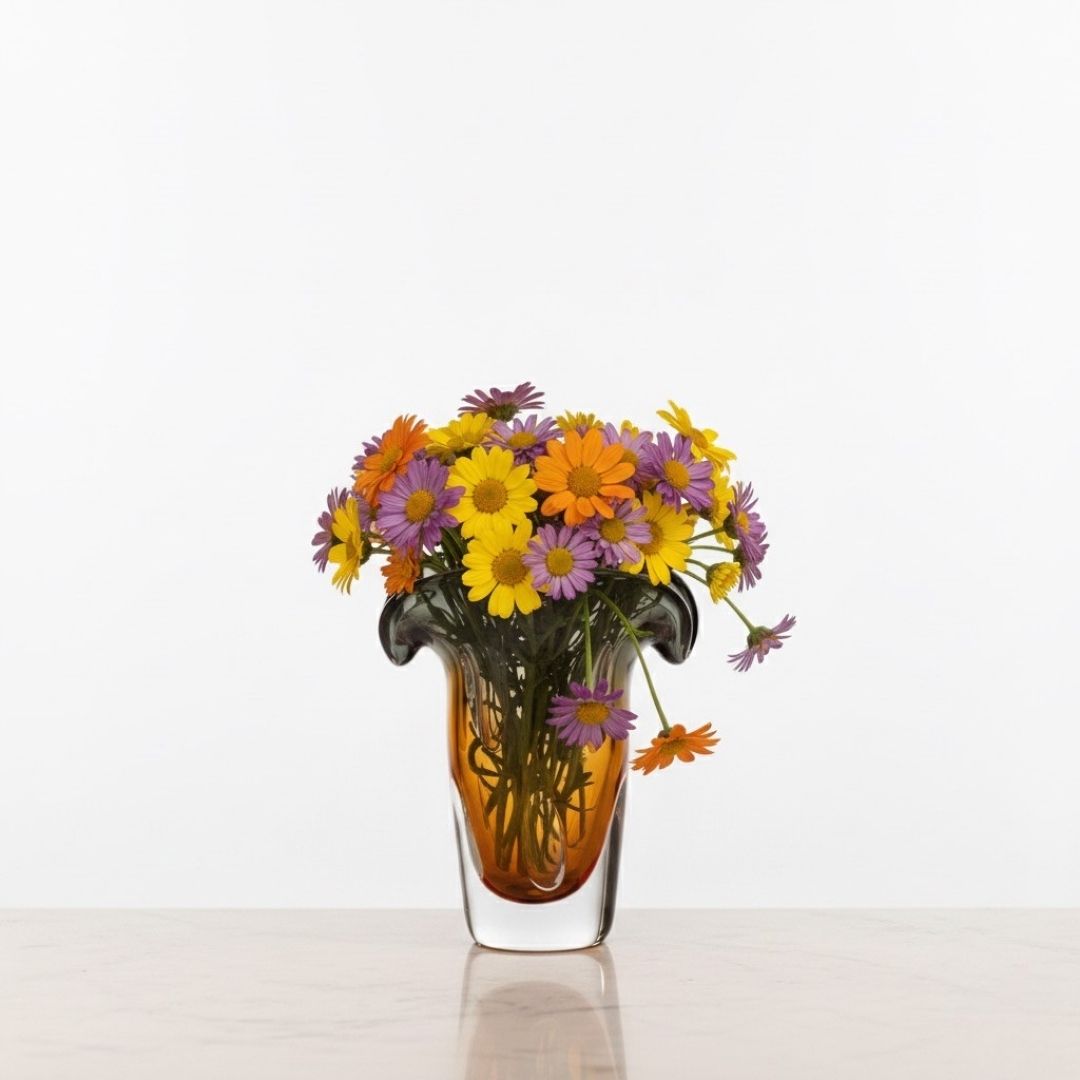 A sculptural amber-and-clear glass vase with a dramatic flared rim and petal-like cutouts. Elegant, eye-catching, and beautifully crafted.