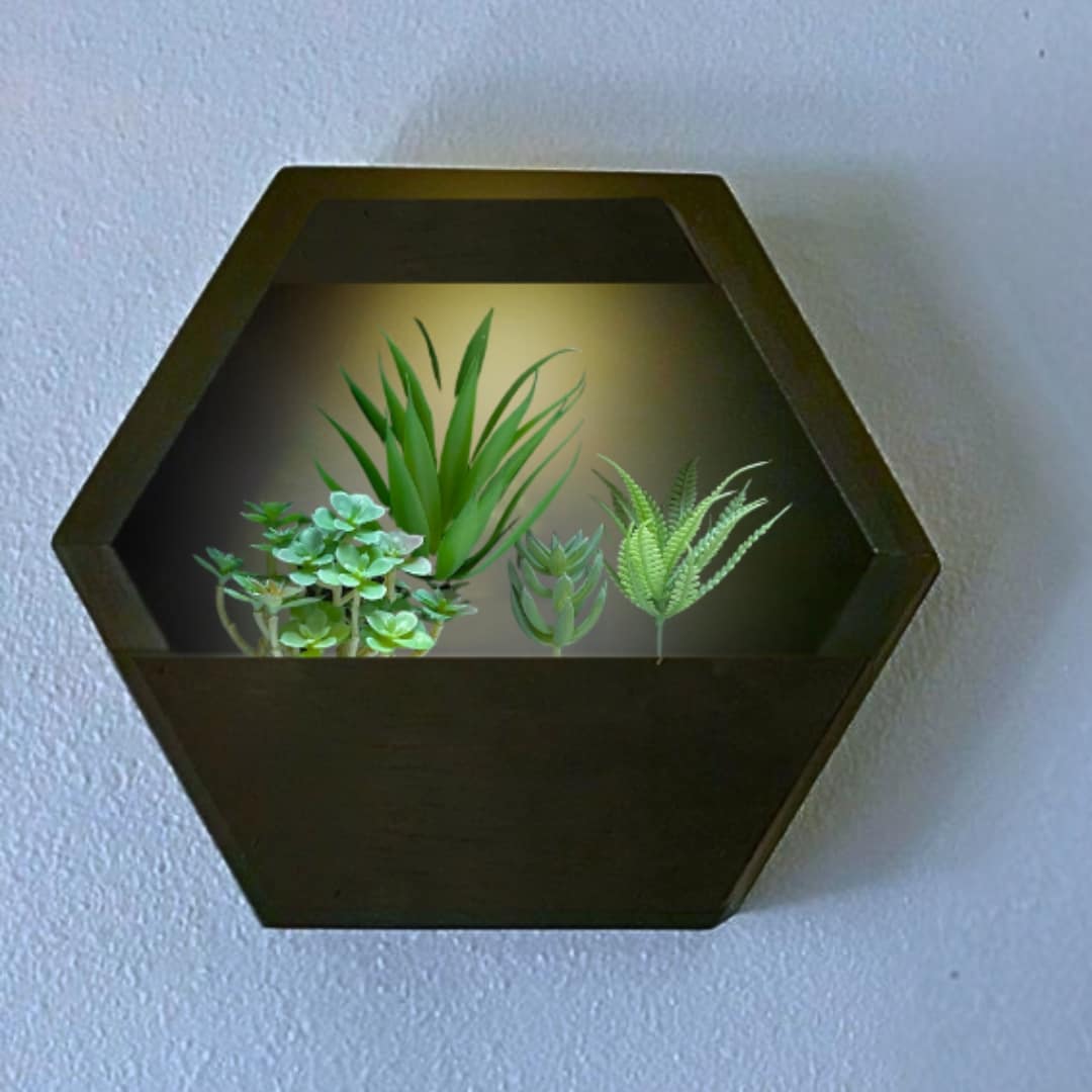 Bold and architectural, this matte-black wall piece elevates greenery into a living sculpture. The internal lighting casts dramatic highlights, transforming humble plants into botanical art. Luxury meets nature in this contemporary showpiece.