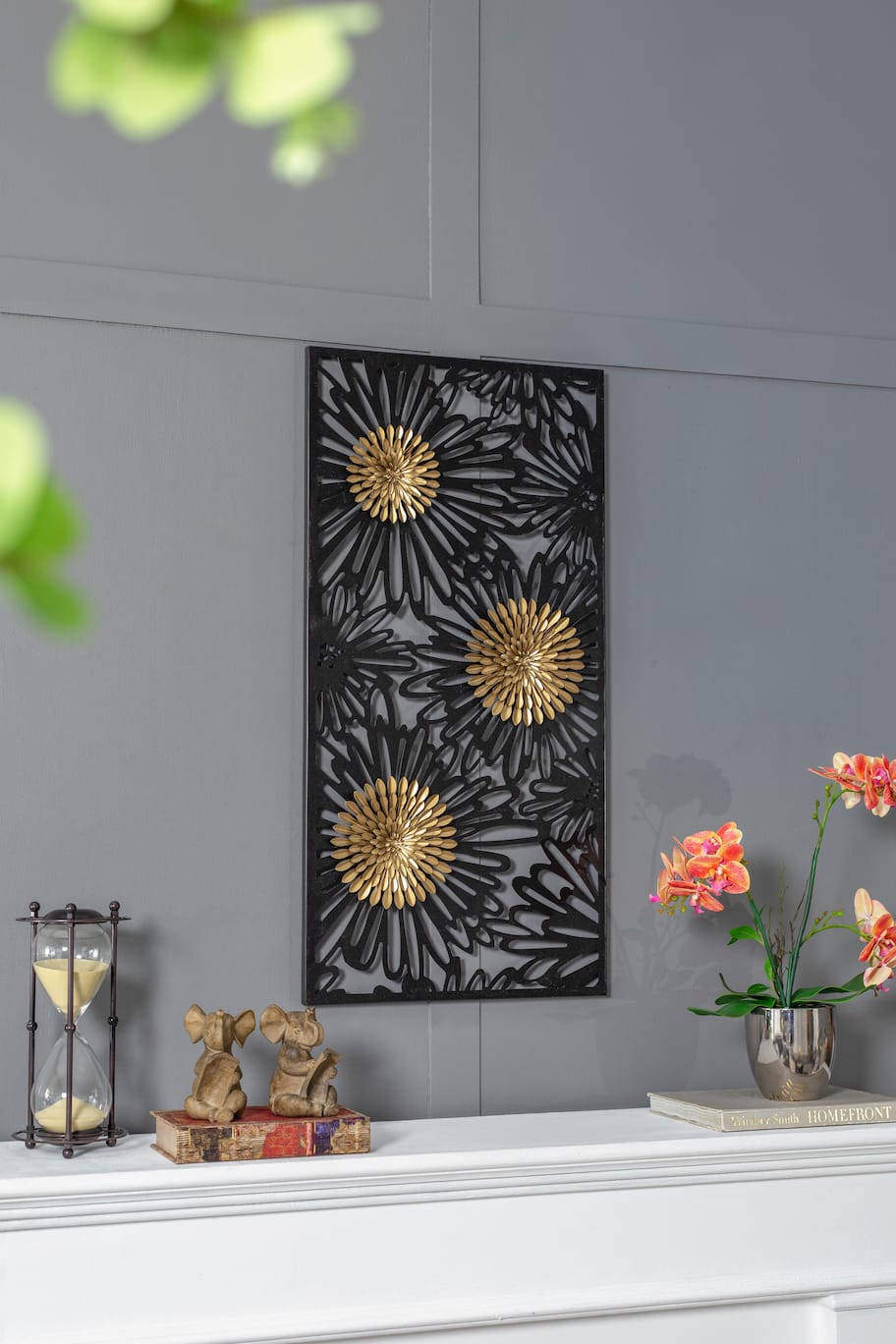 This striking piece of wall art features large floral patterns, where golden accents on the flowers pop against the dark black backdrop. The intricate detailing and bold design make it an eye-catching addition to any space. The combination of gold and black gives it both drama and elegance, while the flower motif provides a natural yet modern flair. This art piece is perfect for adding a sophisticated focal point to your decor.